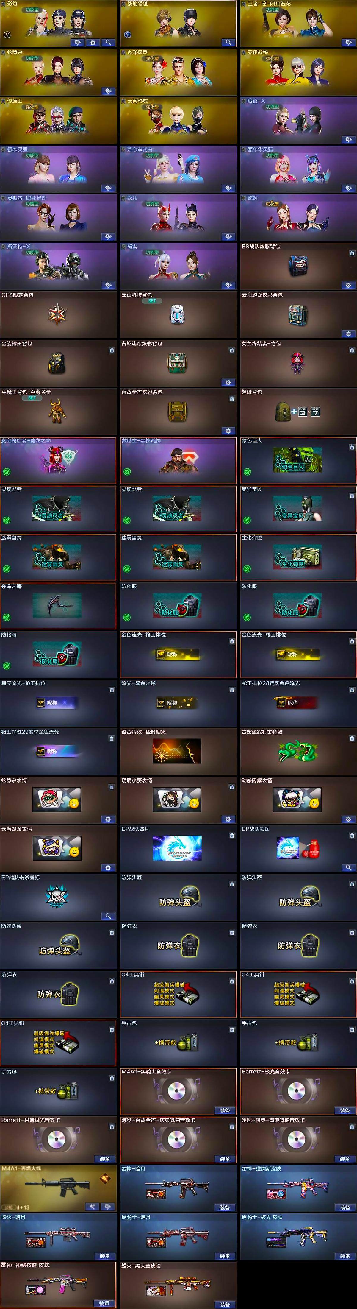 【道具】:BS战队炫彩背包,CFS限定背包,云山科技背包,云海游龙炫彩背包,全能枪王背包,古蛇迷踪炫彩背包,女皇终结者-背包,牛魔王背包-至尊黄金,百战金芒炫彩背包,超级背包,哔哩哔哩名片,女皇终结者-魔龙之吻,救世主-黑桃战神,绿色巨人,灵魂忍者*2,变异宝贝,迷雾幽灵*2,生化弹匣,夺命之镰,防化服*3,金色流光-枪王排位*2,星辰流光-枪王排位,流光-鎏金之域,枪王排位28赛季金色流光,枪王排位29赛季金色流光,语音特效-盛典烟火,古蛇迷踪打击特效,蛇隐宗表情,萌萌小葵表情,动感闪耀表情,云海游龙表情,EP战队名片,EP战队