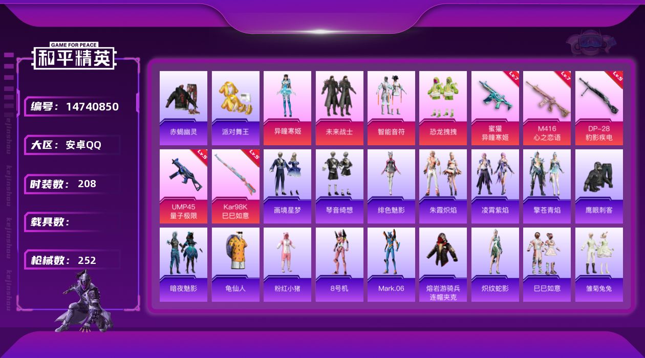 [14740850]可二次【店主推荐捡漏号!可直接换绑】/地铁满天赋 安卓 手Q-4粉装-5特效枪-2粉色飞行器-7.8w热力值-17王牌印记-208套装-252枪皮【热门品类】:套装-赤蝎幽灵,套装-派对舞王,套装-龟仙人,套装-粉红小猪,角色-8号机,角色-Mark.06,熔岩游骑兵连帽夹克【粉色套装】:粉装-未来战士,粉装-智能音符,粉装-恐龙拽拽,角色-异瞳寒姬【粉色枪皮等级】:M416-心之恋语(七级),蜜獾-异瞳寒姬(七级),UMP45-量子极限(五级),Kar98K-巳巳如意(五级),DP-28-豹影疾电(五级)【粉色飞行器】:古堡领主飞行器