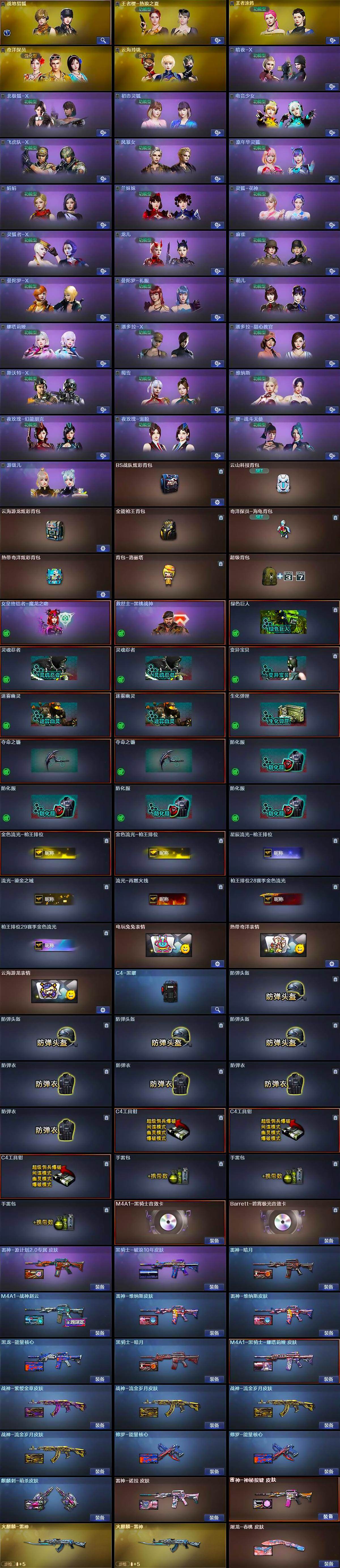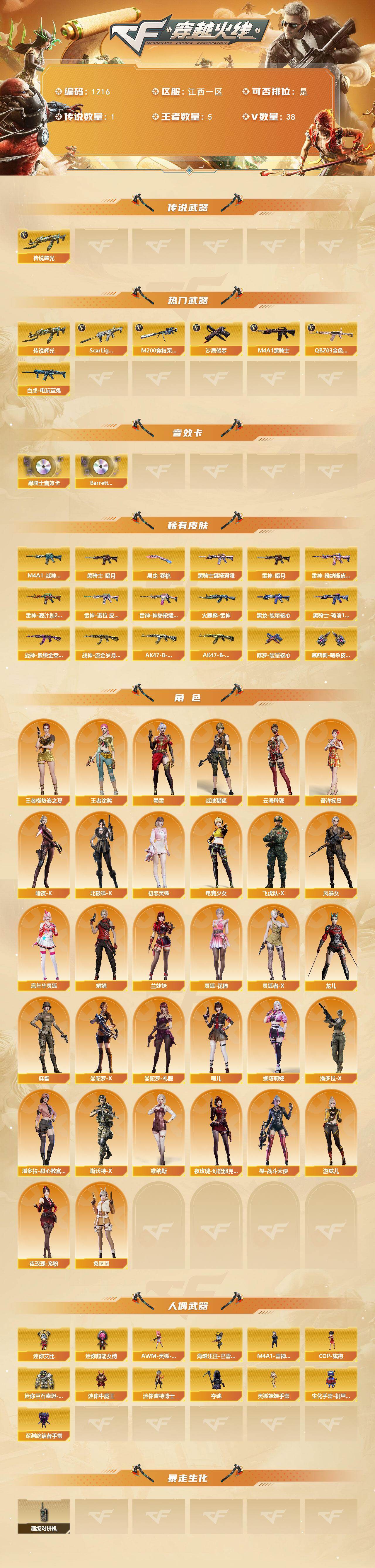 - [15242626]陕西一区-54V-9王者-8炫金 【热门武器】:HK417-朱雀,M200-幻神,死亡之眼,荣耀世冠-火麒麟,荣耀世冠-柯尔特,M4A1-黑骑士,汤姆逊-烈龙*6,RPK-盘龙*5,加特林-炼狱*3,COP-白鲨,沙鹰-修罗*5,荣耀世冠-龙啸,黄金猫猫手套-白鲨 【王者炫金武器】:王者之戮,王者之幻,王者之翼,王者之影,王者之魄,王者之光,炫金超新星*5,炫金天龙*2,炫金天神 【皮肤】:QBZ03-荣耀世冠白鲨,雷神-星空,雷神-冠军之魄,毁灭-冠军之怒,黑龙-能量核心*2,黑龙-冠军之武,黑骑士-地狱火,黑骑士-战神马超,战神-紫绶金章皮肤,战神-流金岁月皮肤,天龙-秘银,龙啸-冠军之啸,龙啸-巅峰荣耀 皮肤,擎天-冠军之击 【角色】:樱,北极狐-X,初恋灵狐,电竞少女,芳心审判者,兰-海滩派对,零-水下丽影,麻雀,青霞仙子 【人偶武器】:COP-白鲨,M4A1-雷神-精英刀锋,迷你钢铁终结者,迷你救赎猎手,迷你生化手雷*2 【暴走生化】:死亡之眼 【英雄级武器】:AK47-火麒麟*3,M4A1-黑龙,M4A1-雷神,M4A1-黑骑士,AK47-机械迷城,AK47-黑鲨,M4A1-龙血,HK417-朱雀,M4A1-猎神*3,王者之武-觉醒版,AK-47-猩红传说*3,黑骑士-海王,荣耀世冠-火麒麟,AWM-天龙,Barrett-毁灭*4,AWM-裁决,M200-幻神,王者之力-觉醒版,RPK-盘龙*5,加特林-炼狱*3,汤姆逊-烈龙*6,沙鹰-修罗*5,沙鹰-天神,荣耀世冠-柯尔特,屠龙,龙啸,擎天,麒麟刺*2,荣耀世冠-龙啸,王者之啸-觉醒版 【道具】:虎牙炫彩背包,超级背包,黄金生化钩,绿色巨人,灵魂忍者,变异宝贝,迷雾幽灵,夺命之镰,防化服*2,金色流光-枪王排位,防弹头盔*3,防弹衣*3,C4工具钳*3,手雷包*4 【特殊枪械】:1黑骑士,6烈龙,5盘龙,3炼狱