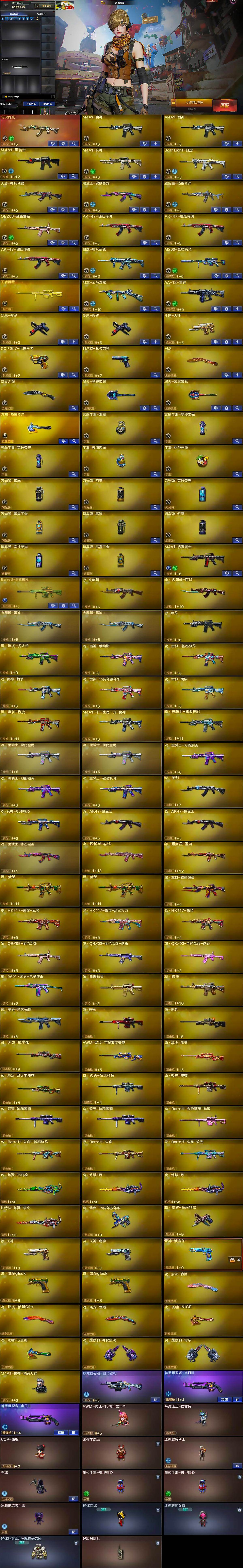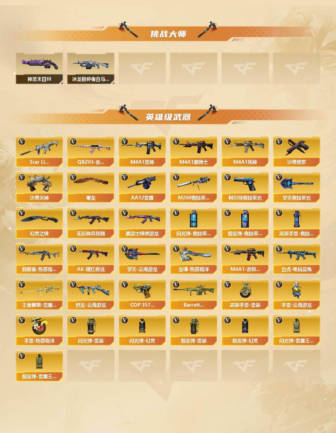 【热门武器】:传说辉光,QBZ03-金色蔷薇,Scar Light-白虎,M200-竞技荣光,白虎-电玩蓝兔,M4A1-黑骑士,沙鹰-修罗*2