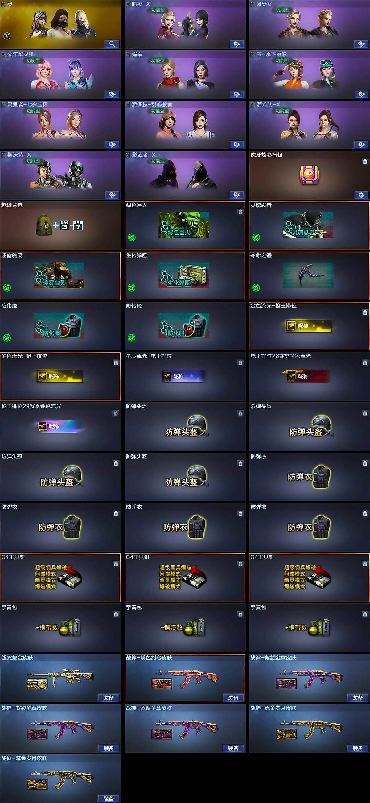 - [13654930]河南一区-23V-0王者-0炫金 【热门武器】:QBZ03-金色蔷薇,汤姆逊-烈龙,RPK-盘龙,沙鹰-修罗*2 【皮肤】:雷神-宇航兔皮肤,火麒麟-雷神,毁灭-神秘黑洞皮肤,无影-能量核心,修罗-能量核心 【角色】:零,葵,乔伊教练,初恋灵狐,风暴女,虎妞,嘉年华灵狐,娟娟,兰妹妹,零-水下丽影,龙儿,龙儿-小淘气,曼陀罗-礼服,潘多拉-X,潘多拉-甜心教官,青霞仙子,蜀雪,兔囡囡,雪莉杨-摸金校尉 【人偶武器】:天龙-曼陀罗,AWM-灵狐-15周年嘉年华,夺魂 【挑战大师】:冰龙粉碎者-白马银枪*2,激光毁灭者III,神圣爆裂者-末日III 【英雄级武器】:M4A1-雷神*2,AK47-无影,M4A1-死神,AK47-黑武士,无影-神兵利器,QBZ03-金色蔷薇,Barrett-毁灭*2,Barrett-金色蔷薇,RPK-盘龙,汤姆逊-烈龙,沙鹰-修罗*2,沙鹰-天神,屠龙,龙啸,擎天*2,麒麟刺*2 【道具】:炫彩背包,女皇终结者-魔龙之吻,夺命之镰,防化服,金色流光-枪王排位*2,星辰流光-枪王排位,EP战队名片,防弹头盔*4,防弹衣*4,C4工具钳*4,手雷包*4 【特殊枪械】:1烈龙,1盘龙