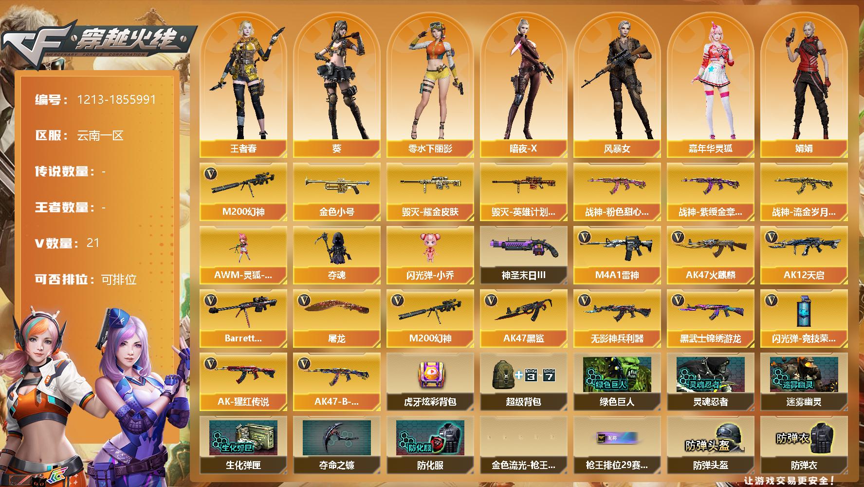 [15015296]云南一区-21V-0王者-0炫金 【热门武器】:M200-幻神,金色小号 【皮肤】:毁灭耀金皮肤,毁灭-英雄计划 皮肤,战神-粉色甜心皮肤,战神-紫绶金章皮肤*3,战神-流金岁月皮肤*2 【角色】:葵,王者春,暗夜-X,风暴女,嘉年华灵狐,娟娟,零-水下丽影,灵狐者-七夕宝贝,潘多拉-甜心教官,潜龙队-X,斯沃特-X,影武者-X 【人偶武器】:AWM-灵狐-15周年嘉年华,夺魂,闪光弹-小乔