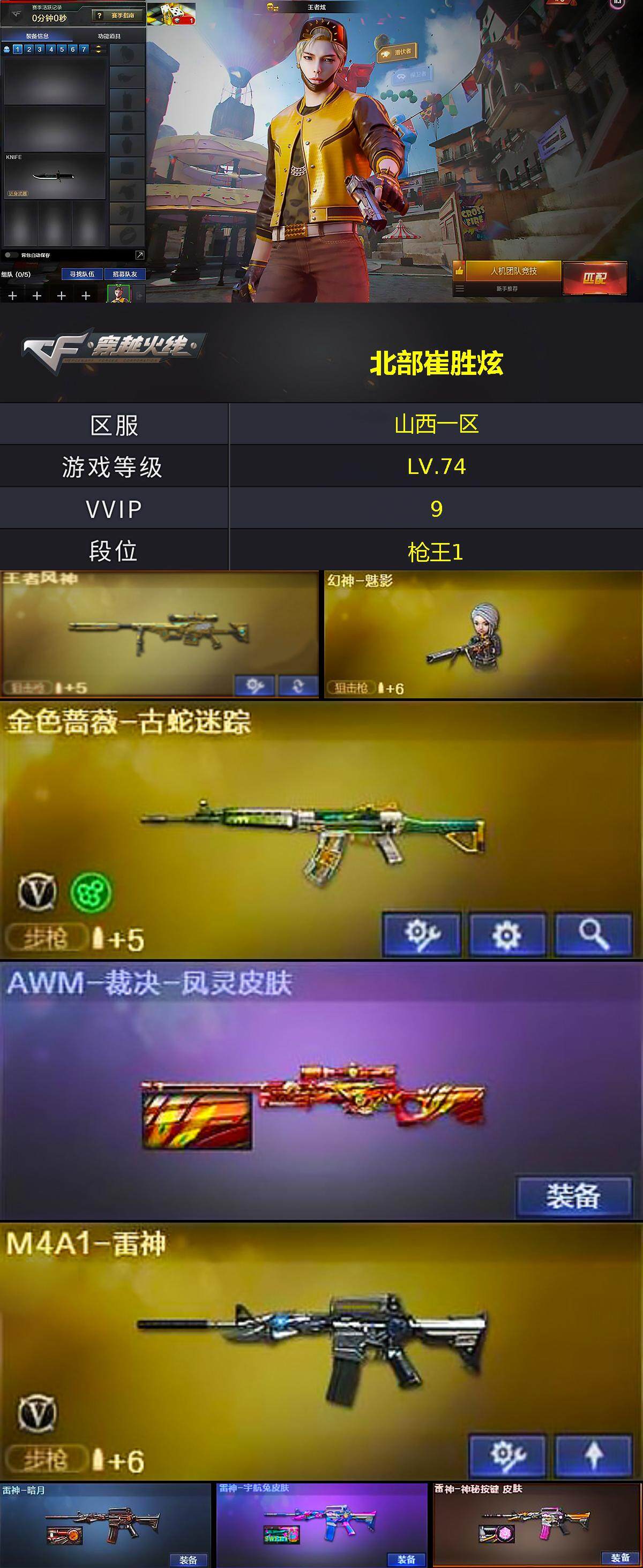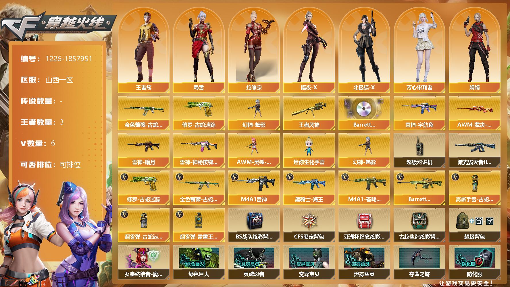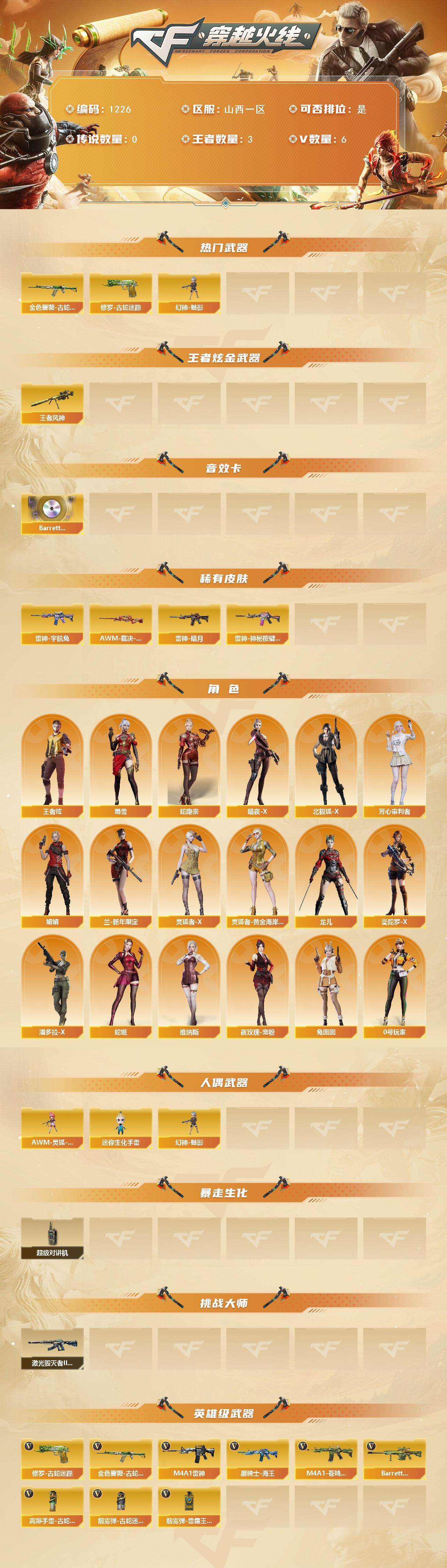 [15015792]山西一区-6V-3王者-0炫金 【热门武器】:金色蔷薇-古蛇迷踪,修罗-古蛇迷踪,幻神-魅影 【王者炫金武器】:王者风神 【音效卡】:Barrett-碧霄极光音效卡 【皮肤】:AWM-裁决-凤灵皮肤,雷神-暗月,雷神-宇航兔皮肤,雷神-神秘按键 皮肤 【角色】:王者炫,蛇隐宗,暗夜-X,北极狐-X,芳心审判者,娟娟,兰-新年限定,0号玩家,灵狐者-X,灵狐者-黄金海岸,龙儿,曼陀罗-X,潘多拉