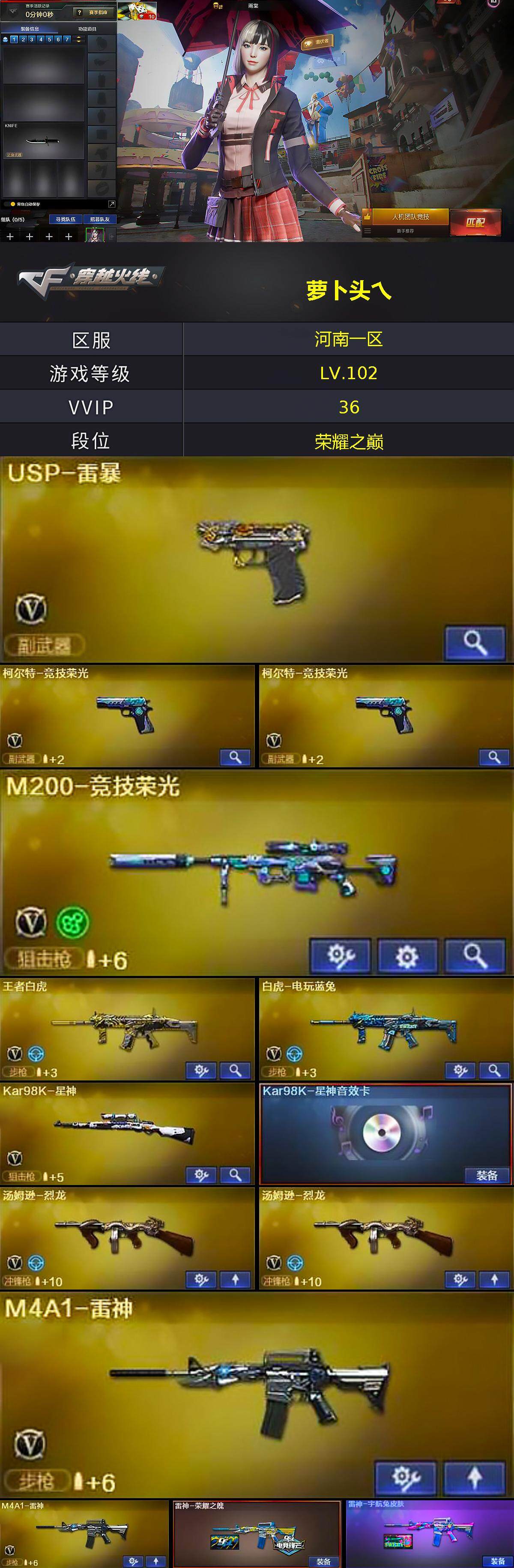 [15016112]河南一区-35V-1王者-0炫金 【热门武器】:M200-竞技荣光,白虎-电玩蓝兔,Kar98K-星神,M4A1-黑骑士,汤姆逊-烈龙*2,USP-雷暴,沙鹰-修罗*4 【音效卡】:M4A1-黑骑士音效卡,Kar98K-星神音效卡 【皮肤】:雷神-荣耀之魄,雷神-宇航兔皮肤,火麒麟-轻羽皮肤,火麒麟-平天大圣,黑骑士-暗月,炼狱-星空 【角色】:雨棠,电竞教官-云悠悠,蛇隐宗,北极狐-X,初恋灵狐,芳心审判者,虎妞,零-水下丽影,麻雀,曼陀罗-X,潘多拉-X,蛇姬,蜀雪,铁骑荣耀,兔囡囡,职业选手 【人偶武器】:天龙-曼陀罗,火麒麟-灵狐,Scar Light-马枪,迷你超能女侍 【暴走生化】:超级对讲机 【挑战大师】:激光毁灭者III 【英雄级武器】:AK47-火麒麟*3,M4A1-雷神*2,M4A1-黑骑士,AK-47-猩红传说*2,AK47-B-常胜将军,王者白虎-觉醒版,白虎-电玩蓝兔,Kar98K-星神,M200-竞技荣光,汤姆逊-烈龙*2,沙鹰-修罗*4,USP-雷暴,柯尔特-竞技荣光*2,擎天-竞技荣光,高爆手雷-竞技荣光*3,高爆手雷-古蛇迷踪,闪光弹-竞技荣光*3,烟雾弹-竞技荣光*3,烟雾弹-古蛇迷踪 【道具】:云山科技背包,炫彩背包,虎牙炫彩背包,绿色巨人,灵魂忍者,迷雾幽灵,夺命之镰,防化服*3,枪王排位29赛季金色流光,蛇隐宗表情,电玩兔兔表情,循环实验表情,EP战队名片,防弹头盔*7,防弹衣*7,C4工具钳*7,手雷包*7 【特殊枪械】:1黑骑士,2烈龙
