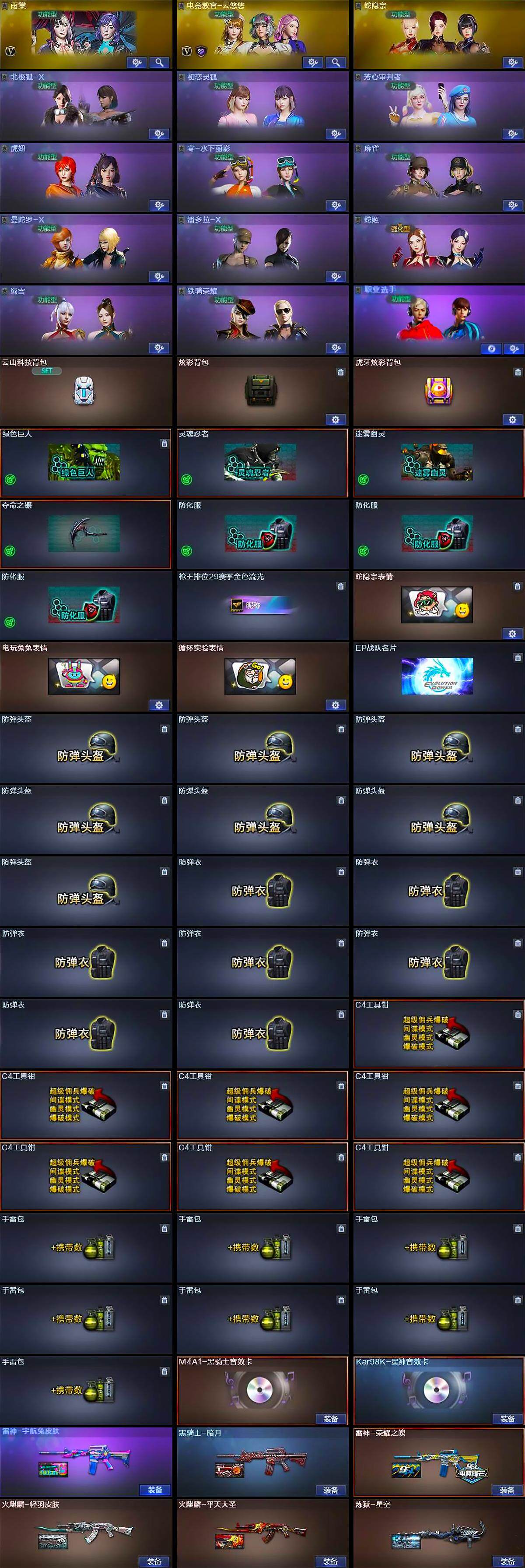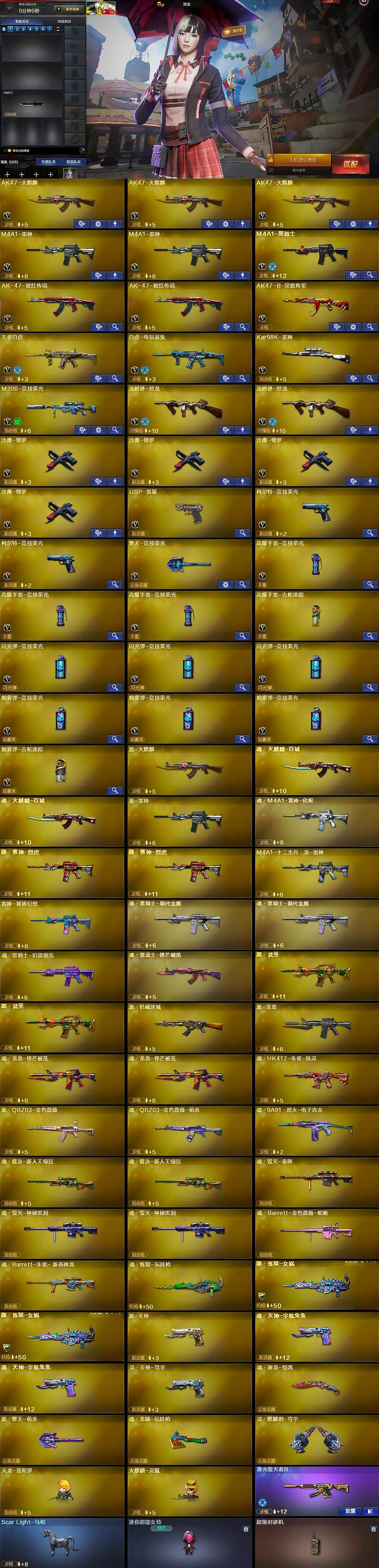 【英雄级武器】:AK47-火麒麟*3,M4A1-雷神*2,M4A1-黑骑士,AK-47-猩红传说*2,AK47-B-常胜将军,王者白虎-觉醒版,白虎-电玩蓝兔,Kar98K-星神,M200-竞技荣光,汤姆逊-烈龙*2,沙鹰-修罗*4,USP-雷暴,柯尔特-竞技荣光*2,擎天-竞技荣光,高爆手雷-竞技荣光*3,高爆手雷-古蛇迷踪,闪光弹-竞技荣光*3,烟雾弹-竞技荣光*3,烟雾弹-古蛇迷踪