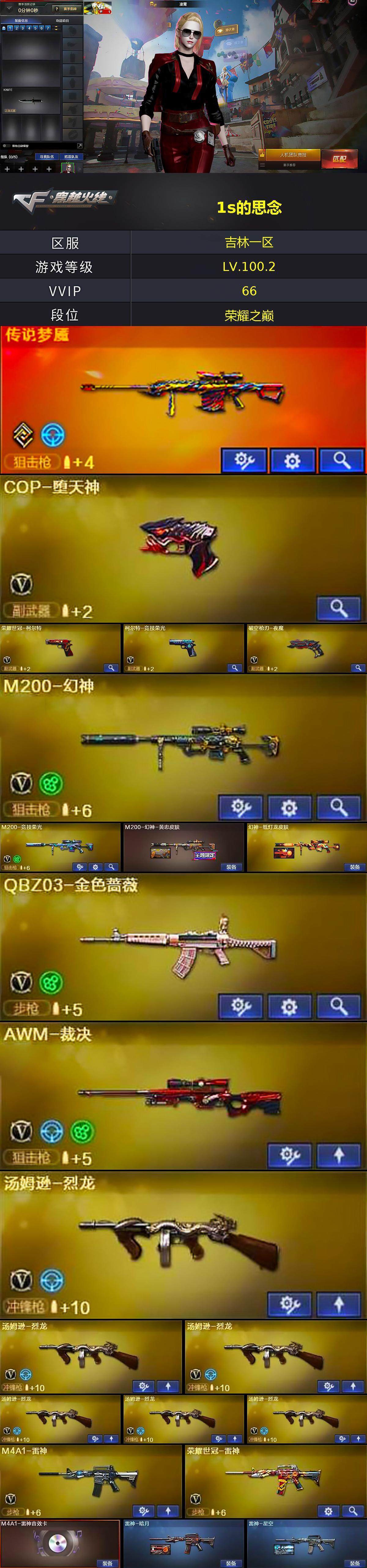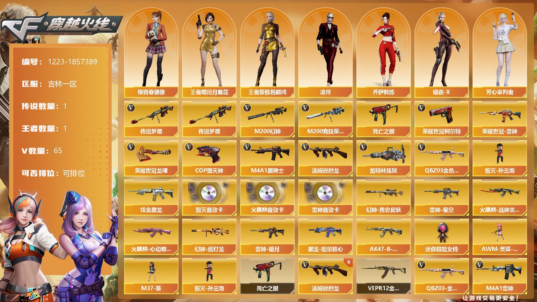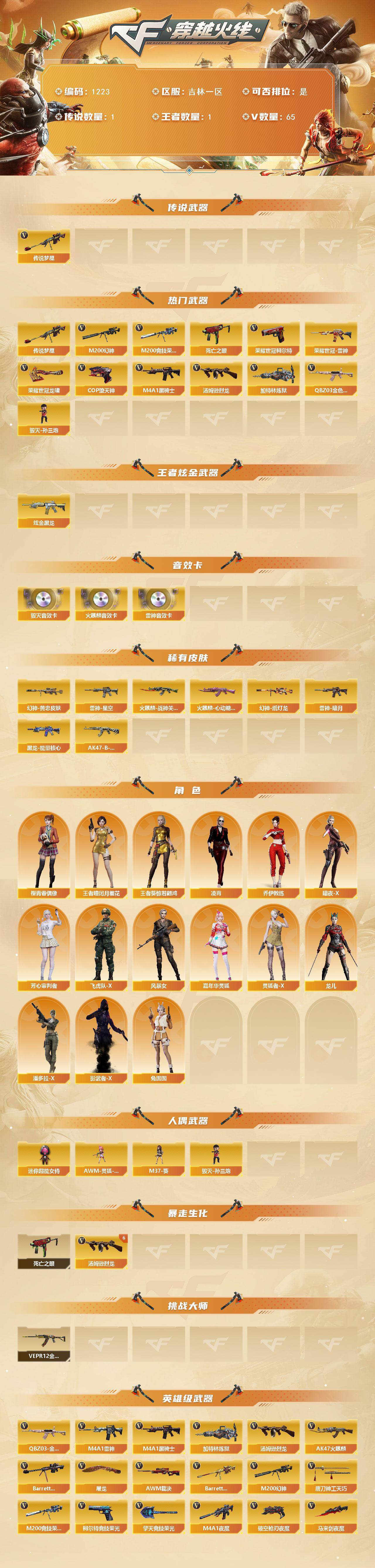 [15016816]吉林一区-65V-1王者-1炫金 【传说武器】:传说梦魇 【热门武器】:传说梦魇,QBZ03-金色蔷薇,M200-幻神,M200-竞技荣光,死亡之眼,荣耀世冠-雷神,荣耀世冠-柯尔特,M4A1-黑骑士,汤姆逊-烈龙*6,加特林-炼狱*2,毁灭-孙三炮,COP-堕天神,荣耀世冠-龙啸 【王者炫金武器】:炫金黑龙 【音效卡】:AK47-火麒麟音效卡,M4A1-雷神音效卡,Barrett-毁灭音效卡