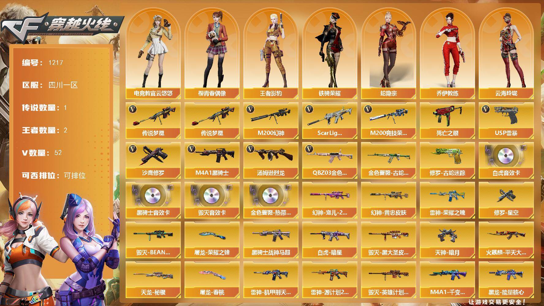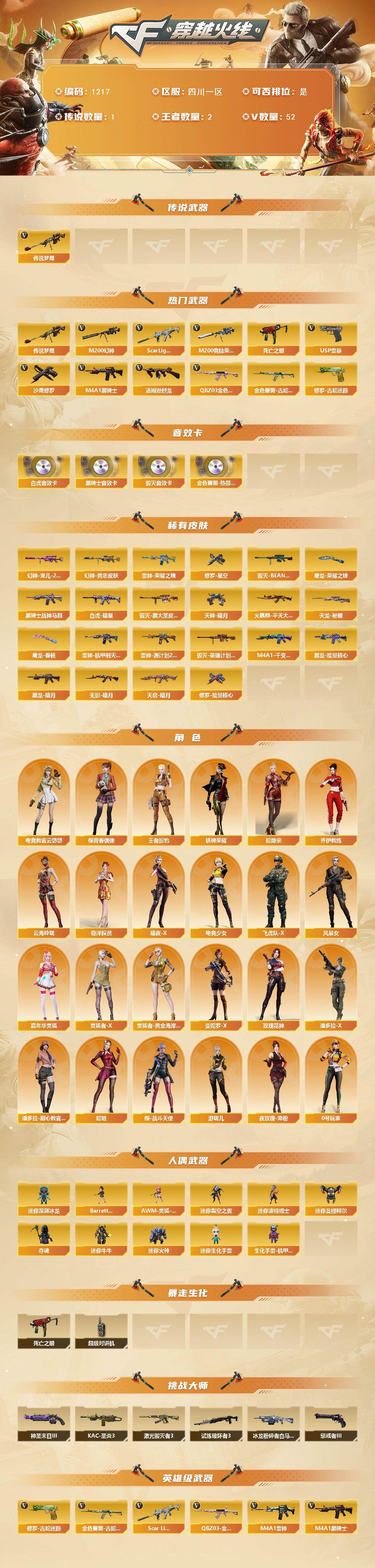 [15017657]四川一区-52V-2王者-0炫金 【传说武器】:传说梦魇 【热门武器】:传说梦魇,QBZ03-金色蔷薇,Scar Light-白虎,M200-幻神,金色蔷薇-古蛇迷踪,修罗-古蛇迷踪,M200-竞技荣光,死亡之眼,M4A1-黑骑士,汤姆逊-烈龙*2,USP-雷暴,沙鹰-修罗 【音效卡】:QBZ03-金色蔷薇-热带奇洋音效卡,M4A1-黑骑士音效卡,Barrett-毁灭音效卡,Scar Ligh