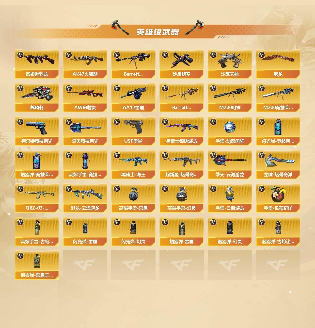 【热门武器】:传说梦魇,QBZ03-金色蔷薇,Scar Light-白虎,M200-幻神,金色蔷薇-古蛇迷踪,修罗-古蛇迷踪,M200-竞技荣光,死亡之眼,M4A1-黑骑士,汤姆逊-烈龙*2,USP-雷暴,沙鹰-修罗