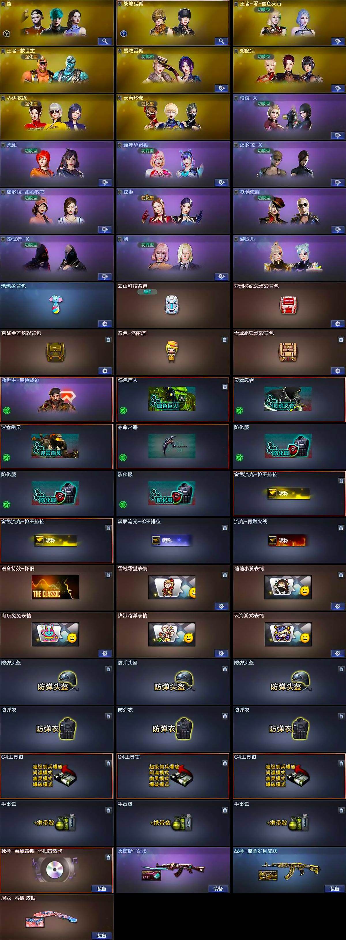 【道具】:泡泡象背包,云山科技背包,亚洲杯纪念炫彩背包,百战金芒炫彩背包,背包-洛丽塔,雪域霜狐炫彩背包,救世主-黑桃战神,绿色巨人,灵魂忍者,迷雾幽灵,夺命之镰,防化服*3,金色流光-枪王排位*2,星辰流光-枪王排位,流光-再燃火线,语音特效-怀旧,雪域霜狐表情,萌萌小葵表情,电玩兔兔表情,热带奇洋表情,云海游龙表情,防弹头盔*3,防弹衣*3,C4工具钳*3,手雷包*3