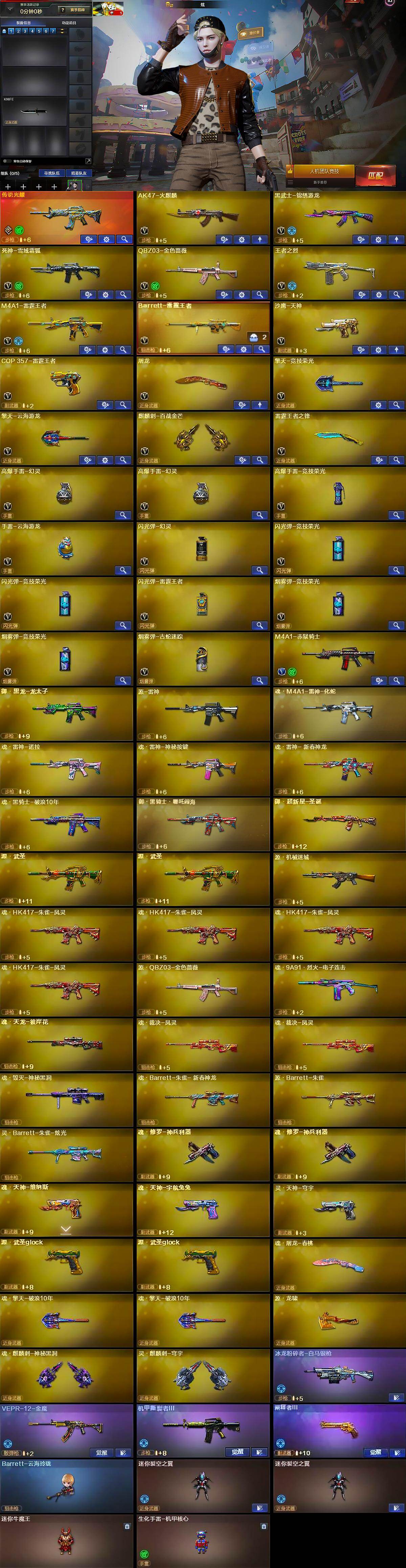 【英雄级武器】:AK47-火麒麟,黑武士-锦绣游龙,死神-雪域霜狐,QBZ03-金色蔷薇,王者之烈-觉醒版,M4A1-雷霆王者-觉醒版,Barrett-雷霆王者-觉醒版,沙鹰-天神,COP 357-雷霆王者-觉醒版,屠龙,擎天-竞技荣光,擎天-云海游龙,麒麟刺-百战金芒,雷霆王者之锋-觉醒版,高爆手雷-幻灵*2,高爆手雷-竞技荣光,手雷-云海游龙,闪光弹-幻灵,闪光弹-竞技荣光*2,闪光弹-雷霆王者-觉醒版,烟雾弹-竞技荣光*2,烟雾弹-古蛇迷踪,M4A1-赤狱骑士