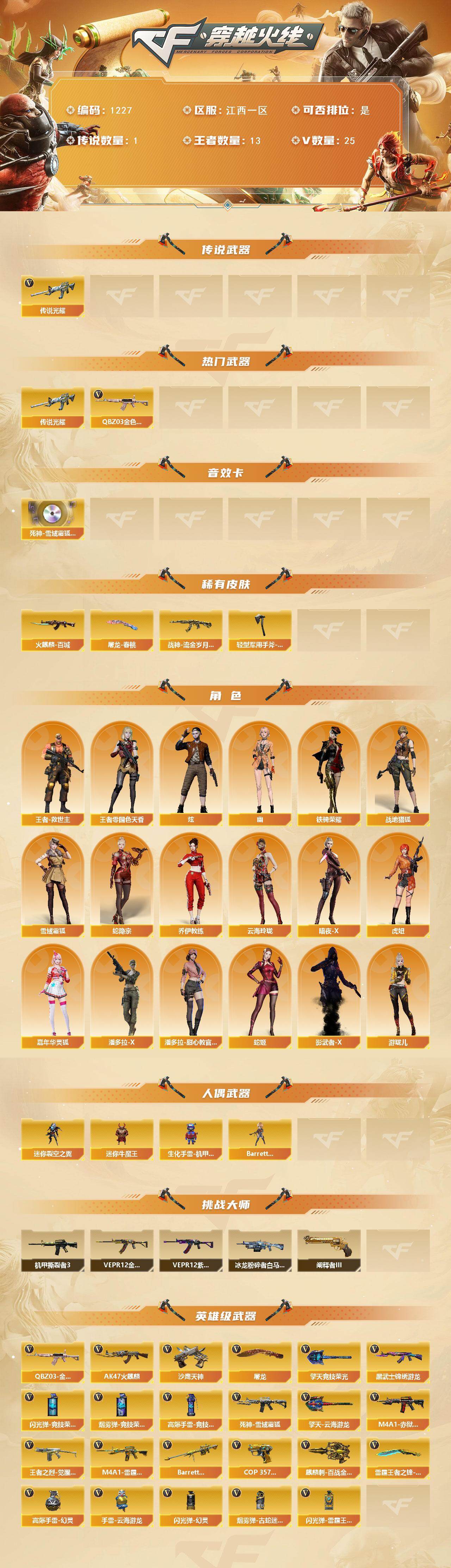 [15018628]江西一区-25V-13王者-0炫金 【传说武器】:传说光耀 【热门武器】:传说光耀,QBZ03-金色蔷薇 【音效卡】:死神-雪域霜狐-怀旧音效卡 【皮肤】:火麒麟-百城,战神-流金岁月皮肤,屠龙-春桃 皮肤,轻型军用手斧-再燃火线 【角色】:炫,战地猎狐,王者-零-国色天香,王者-救世主,雪域霜狐,蛇隐宗,乔伊教练,云海玲珑,暗夜-X,虎妞,嘉年华灵狐,潘多拉-X,潘多拉-甜心教官,蛇姬,铁骑荣耀,影武者-X,幽,游珑儿 【人偶武器】:Barrett-云海玲珑,迷你裂空之翼*2,迷你牛魔王,生化手雷-机甲核心 【挑战大师】:冰龙粉碎者-白马银枪,VEPR-12-金魔,机甲撕裂者III,阐释者III,VEPR-12-紫魔 【英雄级武器】:AK47-火麒麟,黑武士-锦绣游龙,死神-雪域霜狐,QBZ03-金色蔷薇,王者之烈-觉醒版,M4A1-雷霆王者-觉醒版,Barrett-雷霆王者-觉醒版,沙鹰-天神,COP 357-雷霆王者-觉醒版,屠龙,擎天-竞技荣光,擎天-云海游龙,麒麟刺-百战金芒,雷霆王者之锋-觉醒版,高爆手雷-幻灵*2,高爆手雷-竞技荣光,手雷-云海游龙,闪光弹-幻灵,闪光弹-竞技荣光*2,闪光弹-雷霆王者-觉醒版,烟雾弹-竞技荣光*2,烟雾弹-古蛇迷踪,M4A1-赤狱骑士 【道具】:泡泡象背包,云山科技背包,亚洲杯纪念炫彩背包,百战金芒炫彩背包,背包-洛丽塔,雪域霜狐炫彩背包,救世主-黑桃战神,绿色巨人,灵魂忍者,迷雾幽灵,夺命之镰,防化服*3,金色流光-枪王排位*2,星辰流光-枪王排位,流光-再燃火线,语音特效-怀旧,雪域霜狐表情,萌萌小葵表情,电玩兔兔表情,热带奇洋表情,云海游龙表情,防弹头盔*3,防弹衣*3,C4工具钳*3,手雷包*3 【特殊枪械】: