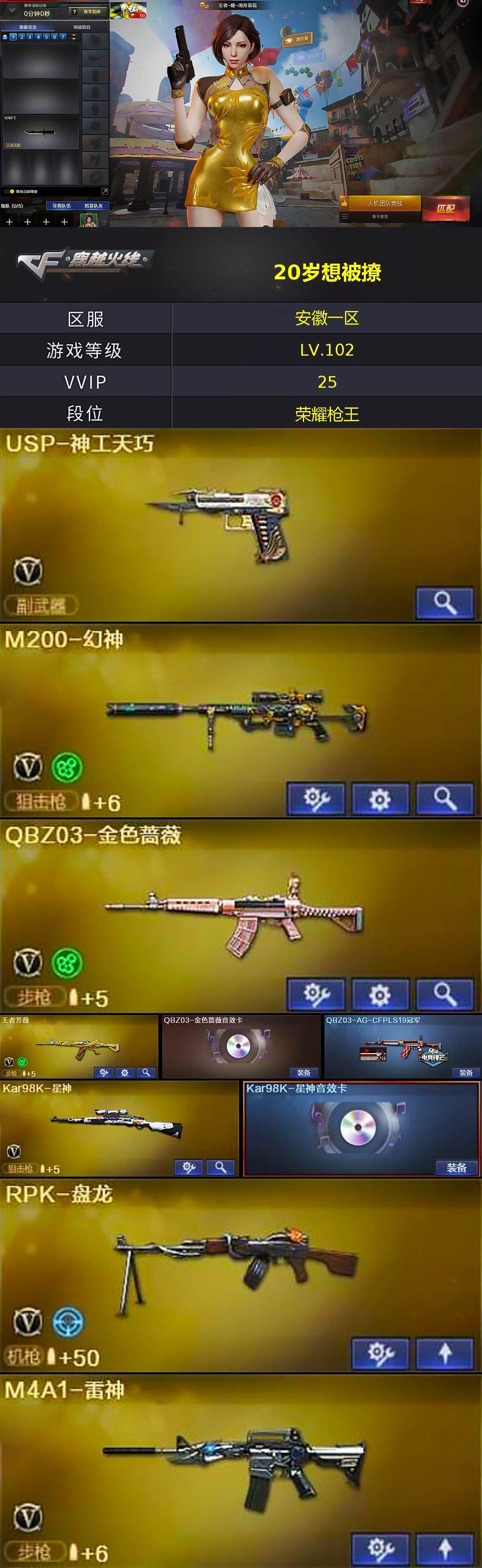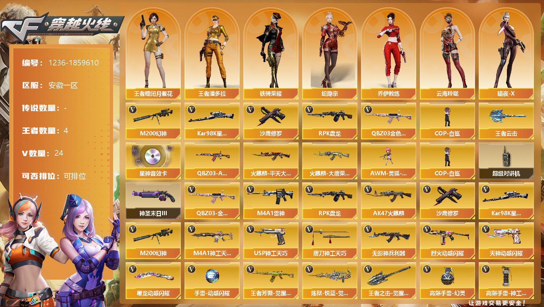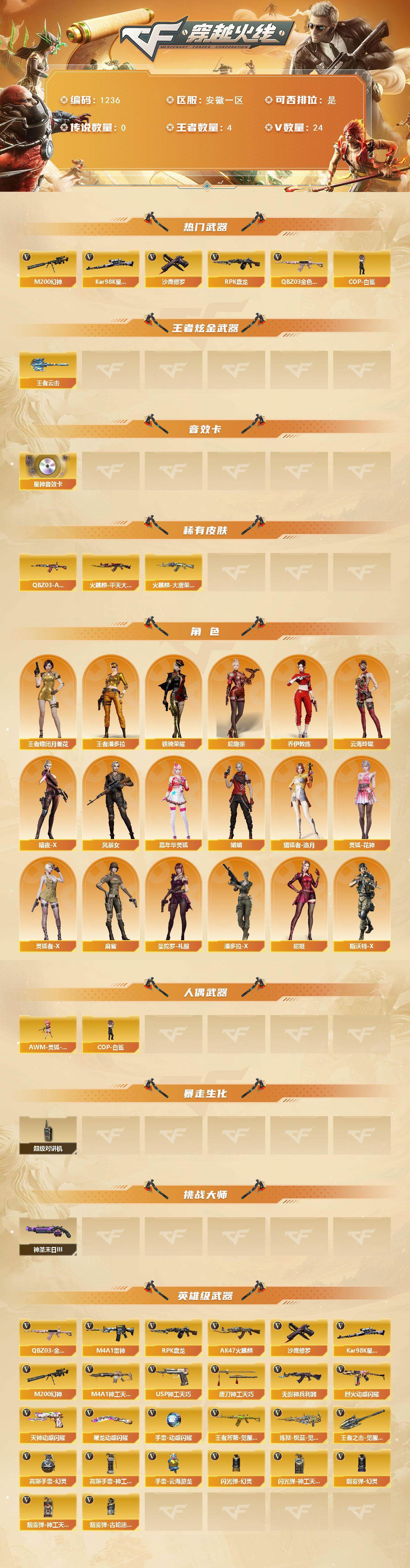 [15018788]安徽一区-24V-4王者-0炫金 【热门武器】:QBZ03-金色蔷薇,M200-幻神,Kar98K-星神,RPK-盘龙,COP-白鲨,沙鹰-修罗*2 【王者炫金武器】:王者云击 【音效卡】:Kar98K-星神音效卡 【皮肤】:QBZ03-AG-CFPLS19冠军,火麒麟-平天大圣,火麒麟-大唐荣光 【角色】:王者-瞳-闭月羞花,王者潘多拉,蛇隐宗,乔伊教练,云海玲珑,暗夜-X,风暴女,嘉年华灵