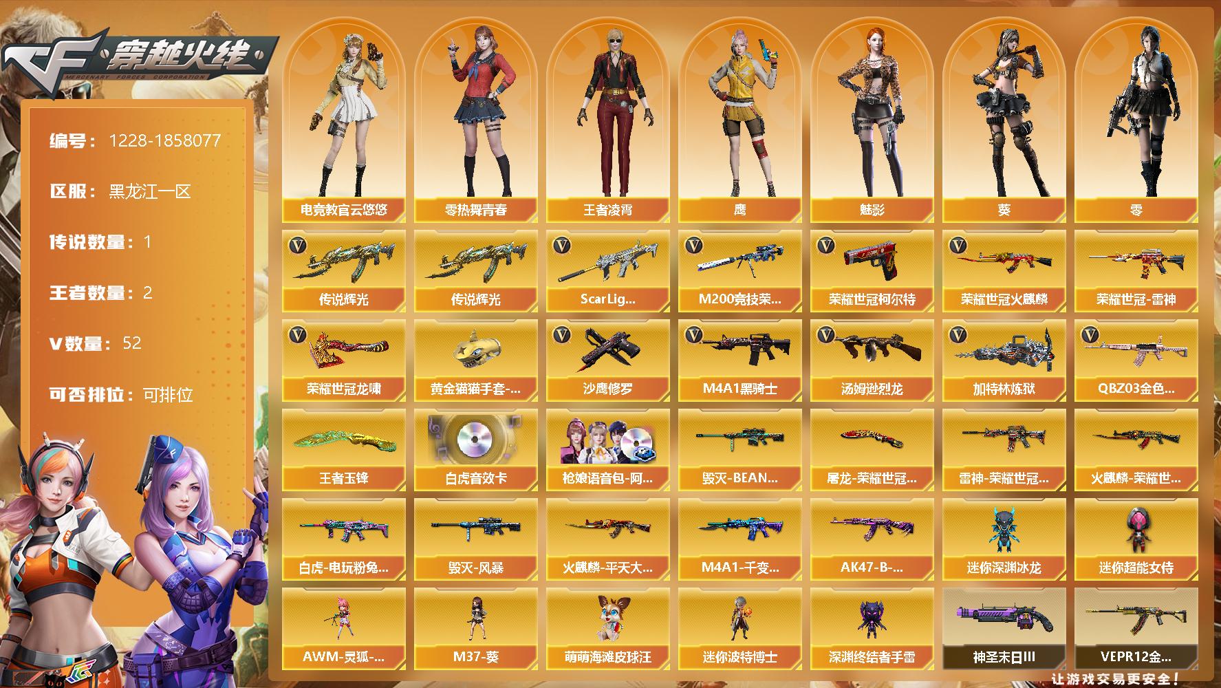 [15022096]黑龙江区-52V-2王者-0炫金 【传说武器】:传说辉光 【热门武器】:传说辉光,QBZ03-金色蔷薇,Scar Light-白虎*2,M200-竞技荣光,荣耀世冠-火麒麟,荣耀世冠-雷神,荣耀世冠-柯尔特*2,M4A1-黑骑士,汤姆逊-烈龙,加特林-炼狱,沙鹰-修罗,荣耀世冠-龙啸*2,黄金猫猫手套-白鲨 【王者炫金武器】:王者玉锋 【音效卡】:Scar Light-白虎音效卡,枪娘语音包-