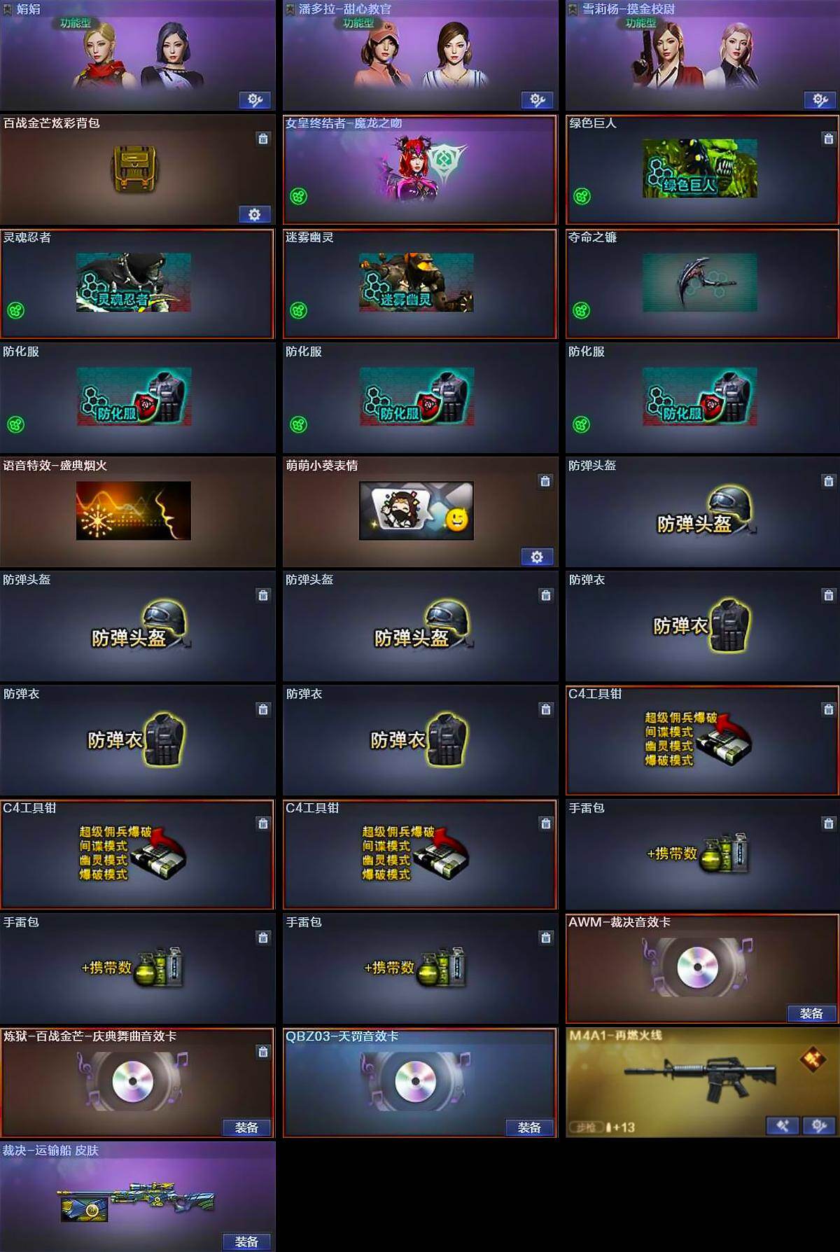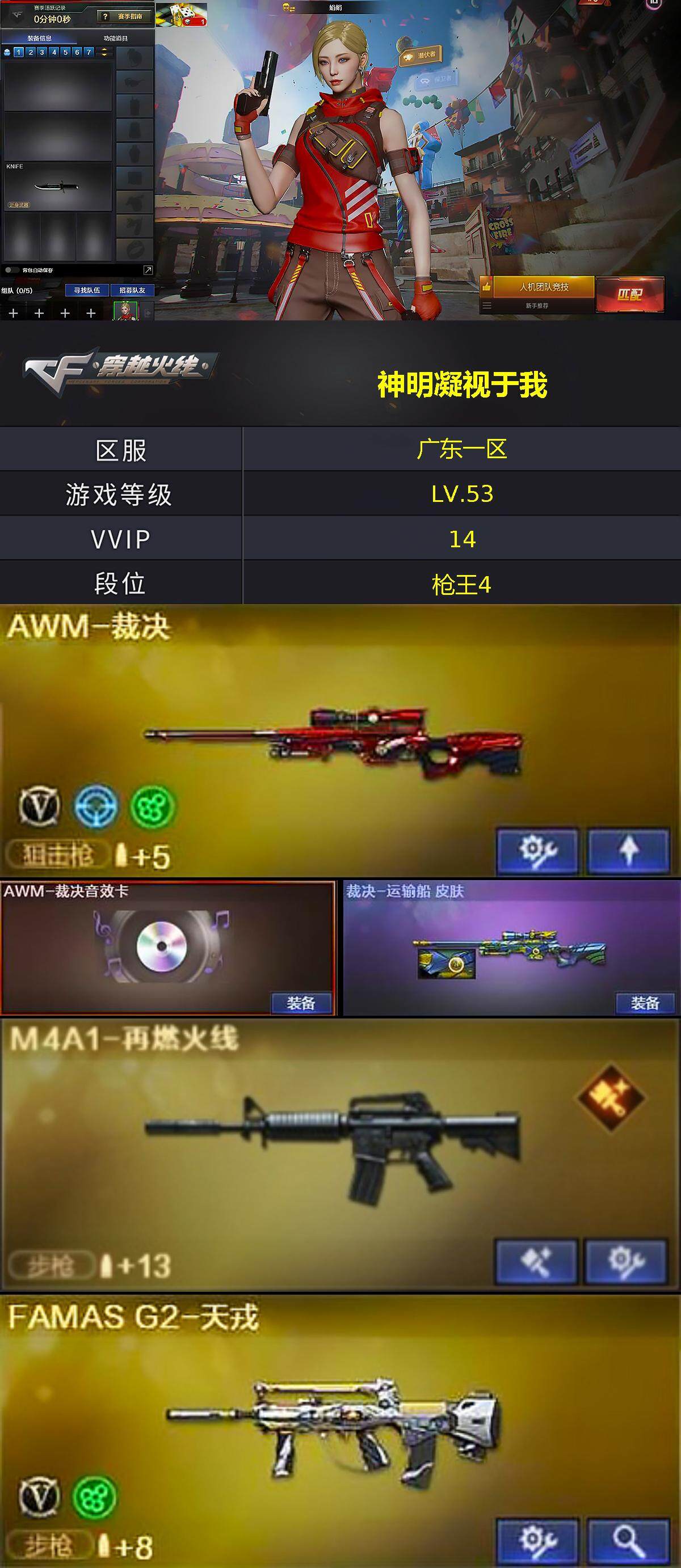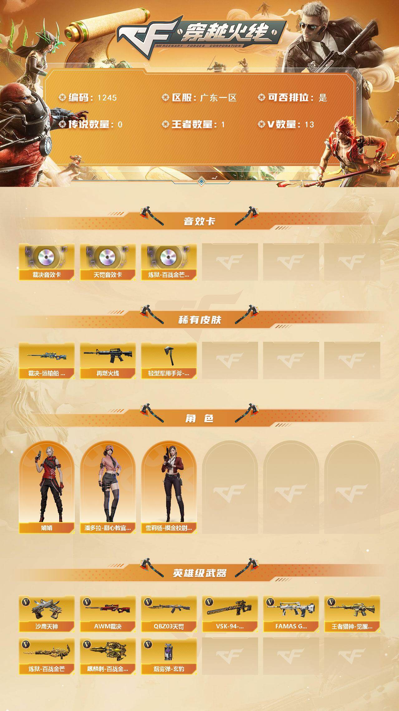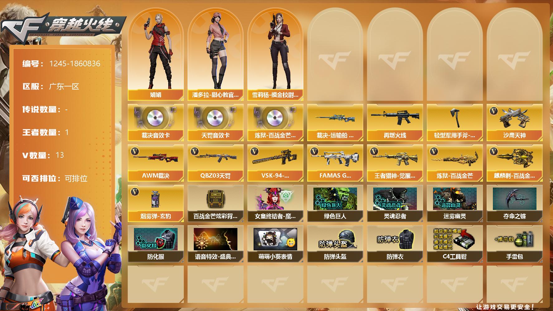 [15022741]广东一区-13V-1王者-0炫金 【音效卡】:AWM-裁决音效卡,QBZ03-天罚音效卡,炼狱-百战金芒-庆典舞曲音效卡 【皮肤】:裁决-运输船 皮肤,M4A1-再燃火线,轻型军用手斧-再燃火线 【角色】:娟娟,潘多拉-甜心教官,雪莉杨-摸金校尉 【英雄级武器】:QBZ03-天罚,FAMAS G2-天戎,王者猎神-觉醒版,AWM-裁决,VSK-94-金蚀,炼狱-百战金芒,沙鹰-天神*3,麒麟刺