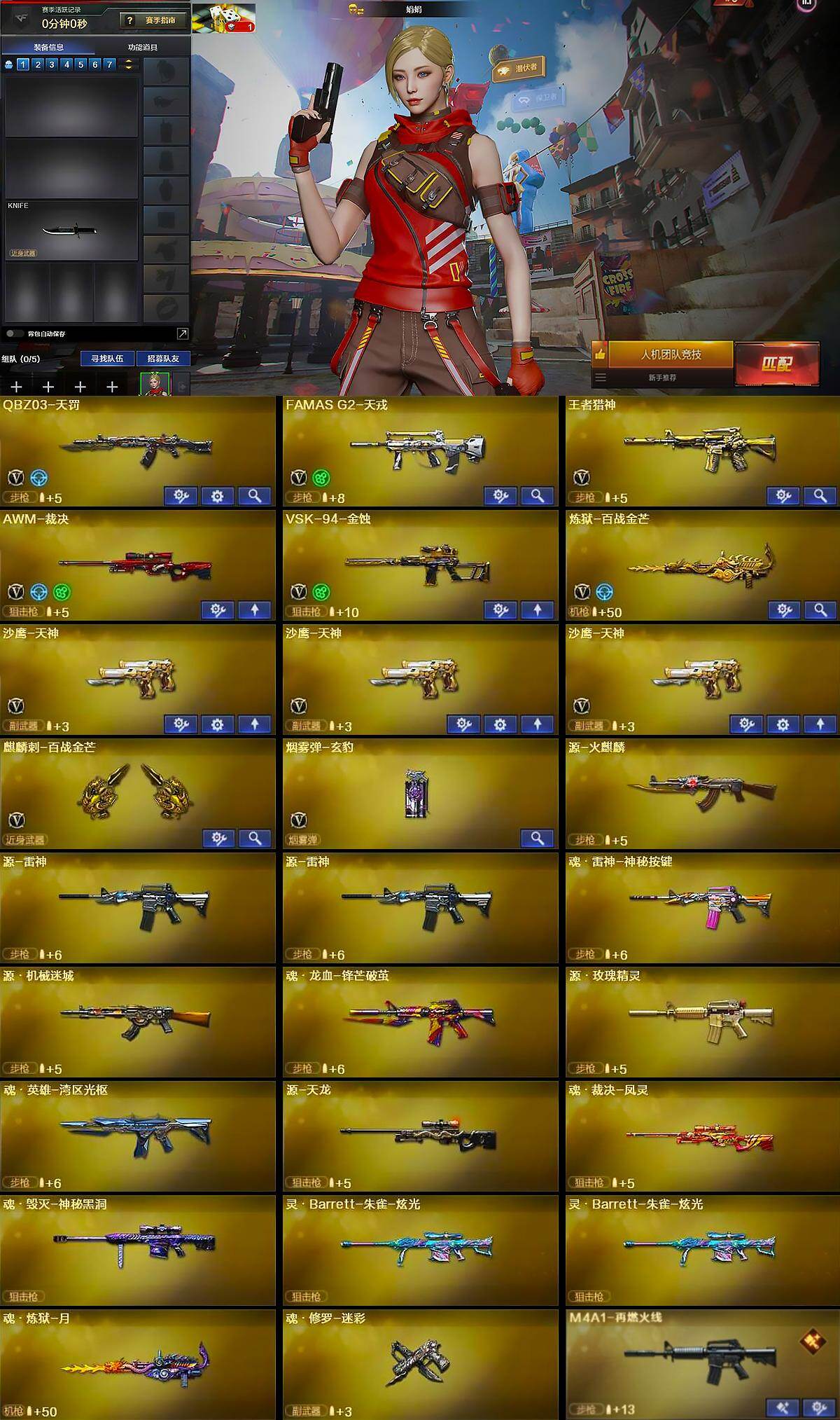 【英雄级武器】:QBZ03-天罚,FAMAS G2-天戎,王者猎神-觉醒版,AWM-裁决,VSK-94-金蚀,炼狱-百战金芒,沙鹰-天神*3,麒麟刺