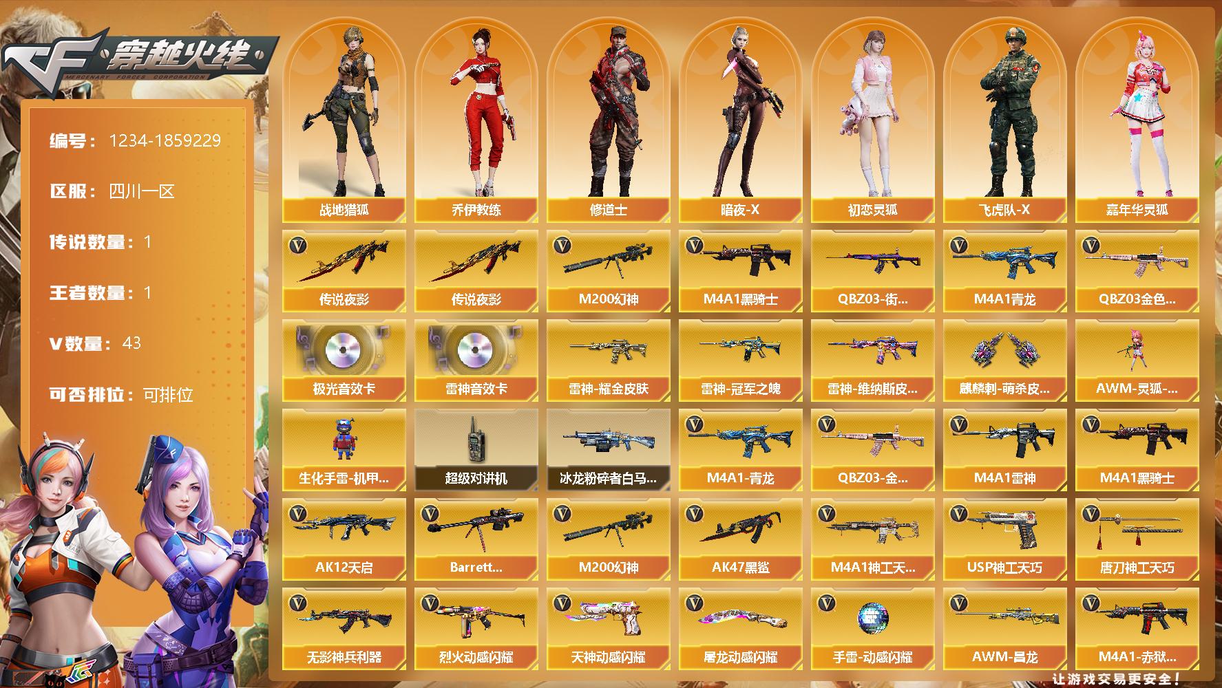 [15023322]四川一区-43V-1王者-0炫金 【传说武器】:传说夜影 【传说角色】:传说艾莉莎 【热门武器】:传说夜影,QBZ03-金色蔷薇,M4A1-青龙,M200-幻神,QBZ03-街机,M4A1-黑骑士 【音效卡】:M4A1-雷神音效卡,Barrett-极光音效卡 【皮肤】:雷神-耀金皮肤,雷神-冠军之魄,雷神-维纳斯皮肤,麒麟刺-萌杀皮肤 【角色】:战地猎狐,乔伊教练,修道士,暗夜-X,初恋灵狐,