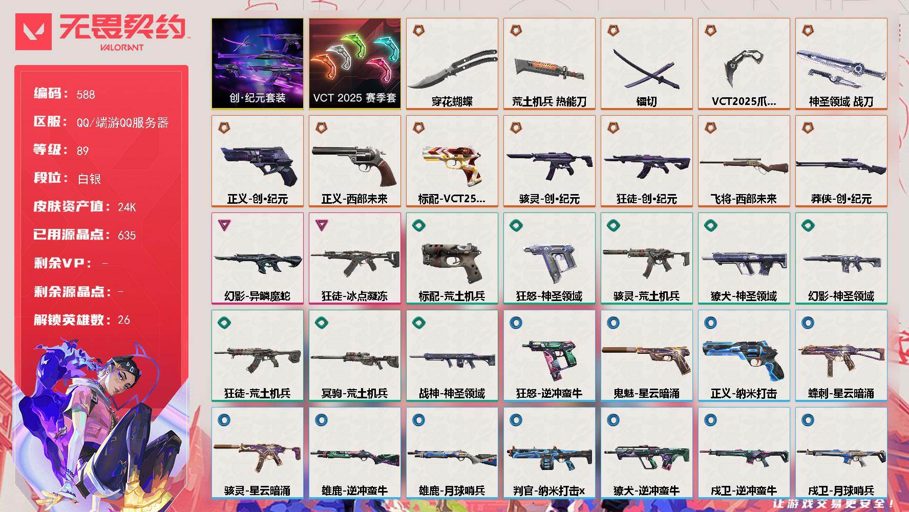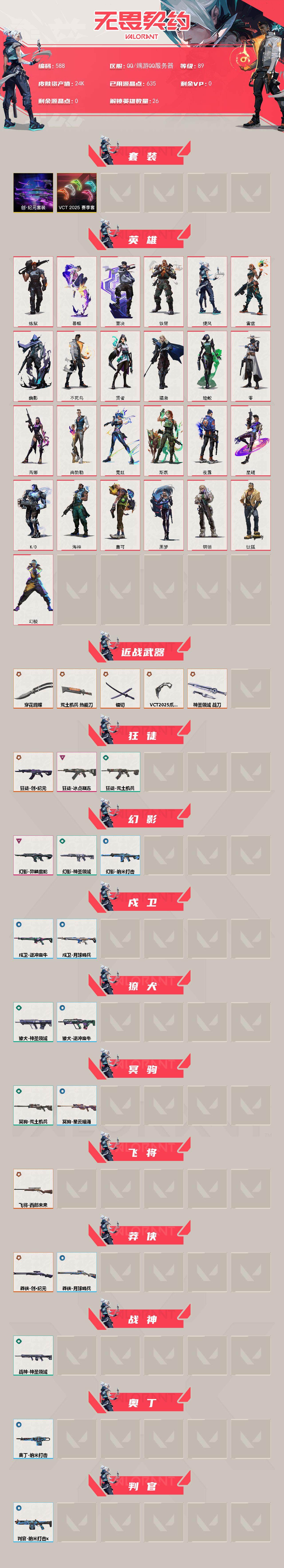 [15024737]【套装】:VCT 2025 赛季套装,创·纪元套装 【英雄】:幻棱,炼狱,暮蝶,钛狐,壹决,铁臂,捷风,雷兹,幽影,不死鸟,贤者,猎枭,蝰蛇,零,芮娜,尚勃勒,霓虹,斯凯,夜露,星礈,K/O,海神,盖可,黑梦,钢锁 【近战武器】:近战武器-穿花蝴蝶,近战武器-VCT 2025 爪刀,近战武器-镭切,近战武器-荒土机兵 热能刀,近战武器-神圣领域 战刀 【狂徒】:狂徒-创·纪元,狂徒-冰点凝冻,狂徒-荒土机兵 【幻影】:幻影-异鳞魔蛇,幻影-神圣领域,幻影-纳米打击 【戍卫】:戍卫-逆冲蛮牛,戍卫-月球哨兵 【獠犬】:獠犬-神圣领域,獠犬-逆冲蛮牛 【冥驹】:冥驹-荒土机兵,冥驹-星云暗涌 【飞将】:飞将-西部未来 【莽侠】:莽侠-创·纪元,莽侠-月球哨兵 【战神】:战神-神圣领域 【奥丁】:奥丁-纳米打击 【判官】:判官-纳米打击x 【雄鹿】:雄鹿-逆冲蛮牛,雄鹿-月球哨兵 【骇灵】:骇灵-创·纪元,骇灵-荒土机兵,骇灵-星云暗涌 【蜂刺】:蜂刺-星云暗涌 【标配】:标配-荒土机兵 【VCT手枪】:标配-VCT25 x EDG 【正义】:正义-创·纪元,正义-西部未来,正义-纳米打击,正义-月球哨兵 【鬼魅】:鬼魅-星云暗涌 【狂怒】:狂怒-神圣领域,狂怒-逆冲蛮牛 【卡面】:终章:激斗汉堡 卡面,进入射程 卡面,分崩离析 卡面,纳米打击 卡面,抑制技术 卡面,激斗汉堡 卡面,瓦娃脸雪糕 P2 卡面,从黄昏到黎明 卡面,荒土机兵 卡面,银弹猎手 卡面,逆冲蛮牛 卡面,《双城之战》拥抱 卡面,精灵大战 卡面,欢迎来到底城 卡面,南瓜盛典 卡面,正义的化身 卡面,时间到 卡面,最高舞台 卡面,声感陷阱设计图 卡面,梦幻奶茶 卡面,无畏契约GO!第一卷:芮娜 卡面,清除名单 卡面,无畏契约GO!第一卷:零 卡面,无畏契约GO!第一卷:贤者 卡面,铁臂设计图 卡面,代号红色 卡面,冰淇淋店 卡面,新兵报到 卡面,友军火力 卡面,V契约 卡面,无畏契约 卡面 【喷漆】:小小心意 喷漆,战“素”兔 喷漆,宇宙的指引 喷漆,请求重启 喷漆,逆冲蛮牛 喷漆,纳米打击 喷漆,鼻尖上的蝴蝶 喷漆,简笔画黯兽 喷漆,独守蝰腹 喷漆,他们将落荒而逃 喷漆,通缉:战术企鹅 喷漆,荒土机兵 喷漆,别挡我吃球! 喷漆,嗨宝南瓜灯 喷漆,嘭! 喷漆,都算到了 喷漆,控场勿近 喷漆,熊抱 喷漆,超