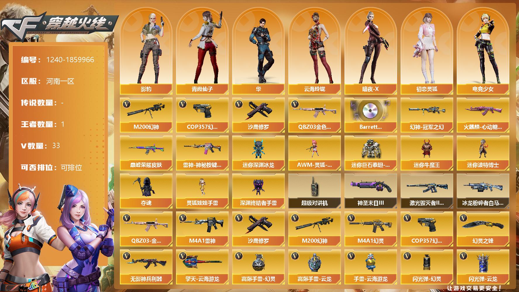 [15024751]河南一区-33V-1王者-0炫金 【热门武器】:QBZ03-金色蔷薇,M200-幻神,COP 357-幻灵*3,沙鹰-修罗*3 【音效卡】:Barrett-碧霄极光音效卡 【皮肤】:幻神-冠军之幻,QBZ03-巅峰荣耀皮肤,雷神-神秘按键 皮肤,火麒麟-心动糖果 【角色】:影豹,华,云海玲珑,暗夜-X,初恋灵狐,电竞少女,芳心审判者,虎妞,嘉年华灵狐,娟娟,兰-新年限定,0号玩家,灵狐者-X,