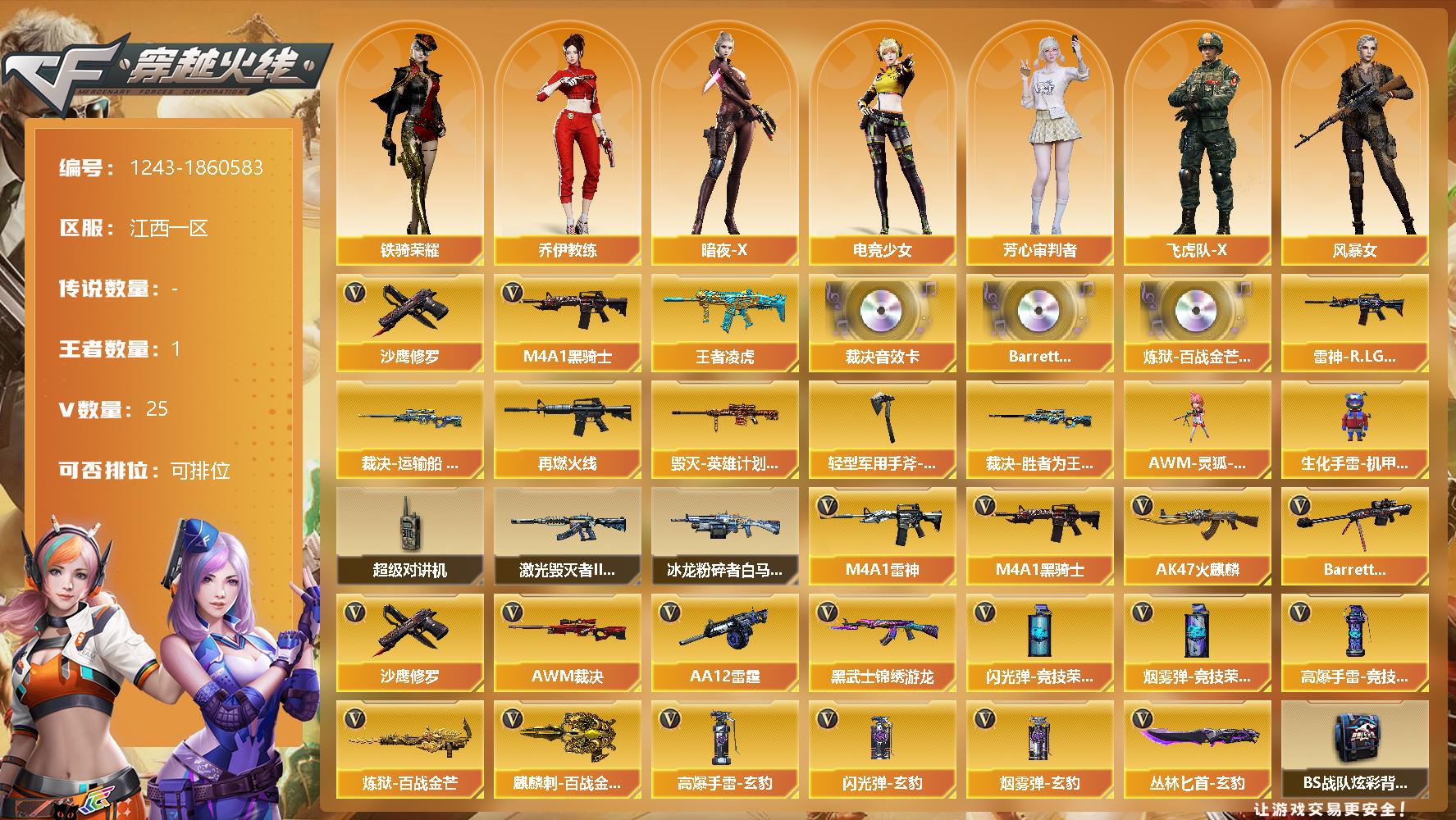 [15031216]江西一区-25V-1王者-0炫金 【热门武器】:M4A1-黑骑士,沙鹰-修罗*2 【王者炫金武器】:王者凌虎 【音效卡】:AWM-裁决音效卡,Barrett-碧霄极光音效卡,炼狱-百战金芒-庆典舞曲音效卡 【皮肤】:裁决-运输船 皮肤,裁决-胜者为王 皮肤,雷神-R.LGD-CFPLS18冠军,M4A1-再燃火线,毁灭-英雄计划 皮肤,轻型军用手斧-再燃火线 【角色】:乔伊教练,暗夜-X,电竞