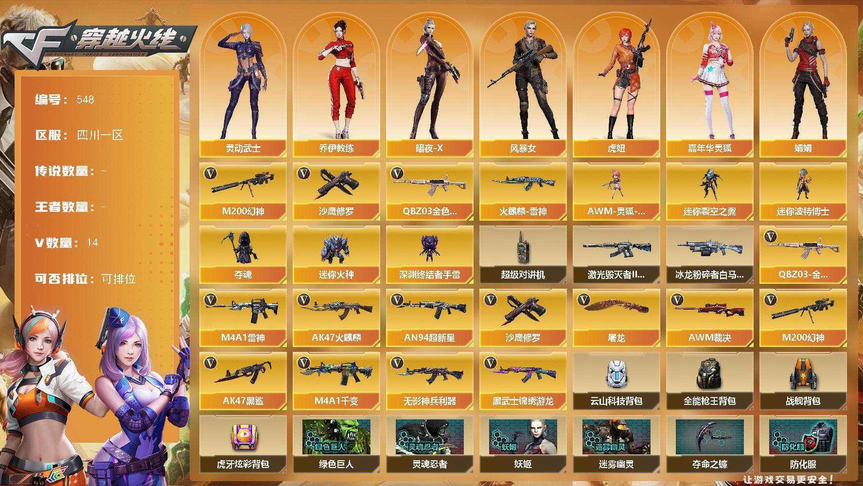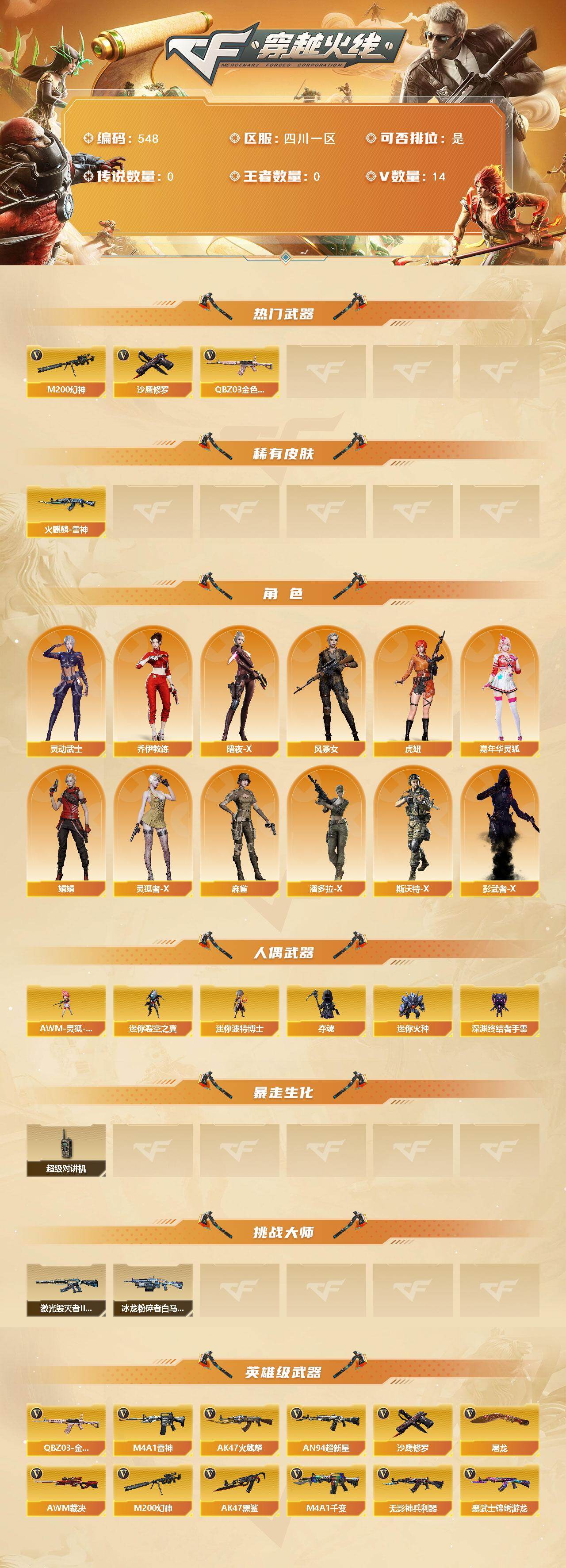 [15032210]四川一区-14V-0王者-0炫金 【热门武器】:QBZ03-金色蔷薇,M200-幻神,沙鹰-修罗 【皮肤】:火麒麟-雷神 【角色】:乔伊教练,暗夜-X,风暴女,虎妞,嘉年华灵狐,娟娟,灵动武士,灵狐者-X,麻雀,潘多拉-X,斯沃特-X,影武者-X 【人偶武器】:AWM-灵狐-15周年嘉年华,迷你裂空之翼,迷你波特博士*7,夺魂,迷你火种*2,深渊终结者手雷 【暴走生化】:超级对讲机 【挑战大师】:冰龙粉碎者-白马银枪,激光毁灭者III-白马银枪 【英雄级武器】:M4A1-千变,AK47-火麒麟,M4A1-雷神,AN94-超新星,AK47-黑鲨,无影-神兵利器,黑武士-锦绣游龙,QBZ03-金色蔷薇,AWM-裁决,M200-幻神,沙鹰-修罗,屠龙 【道具】:云山科技背包,全能枪王背包,战舰背包,虎牙炫彩背包,绿色巨人,灵魂忍者,妖姬,迷雾幽灵,夺命之镰,防化服*3,金色流光-枪王排位*2,星辰流光-枪王排位,枪王排位28赛季金色流光,防弹头盔*5,防弹衣*5,C4工具钳*5,手雷包*6 【特殊枪械】:
