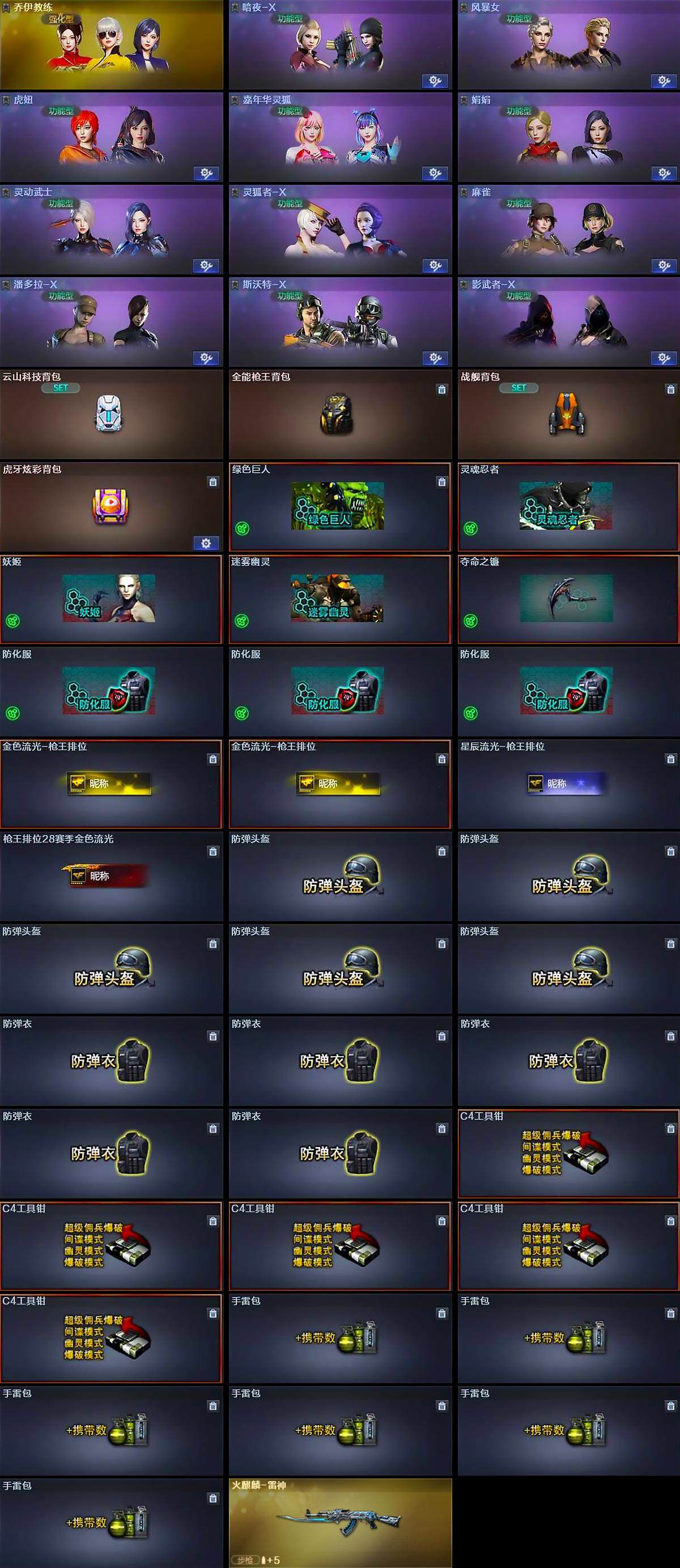 【道具】:云山科技背包,全能枪王背包,战舰背包,虎牙炫彩背包,绿色巨人,灵魂忍者,妖姬,迷雾幽灵,夺命之镰,防化服*3,金色流光-枪王排位*2,星辰流光-枪王排位,枪王排位28赛季金色流光,防弹头盔*5,防弹衣*5,C4工具钳*5,手雷包*6