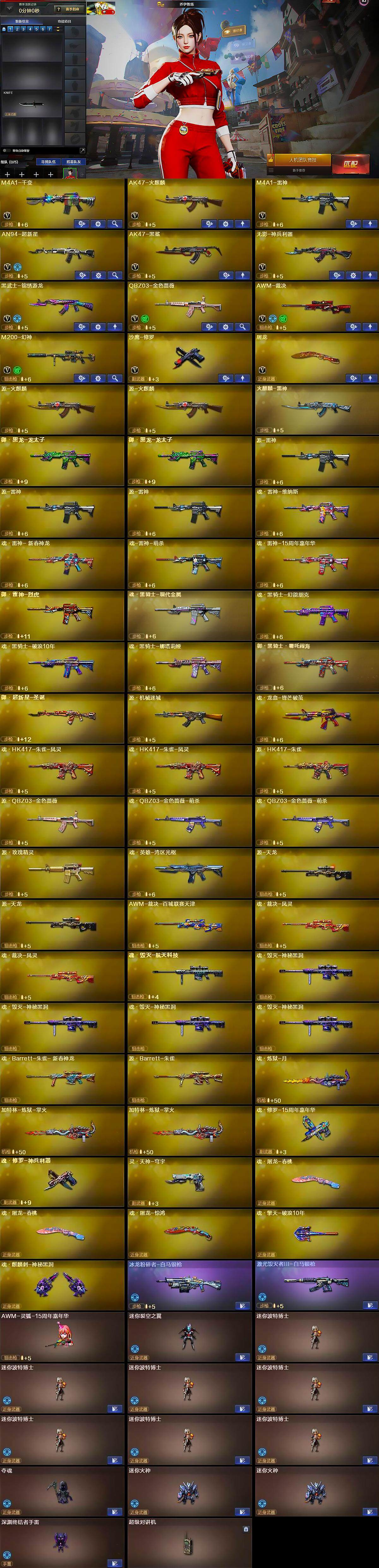 【英雄级武器】:M4A1-千变,AK47-火麒麟,M4A1-雷神,AN94-超新星,AK47-黑鲨,无影-神兵利器,黑武士-锦绣游龙,QBZ03-金色蔷薇,AWM-裁决,M200-幻神,沙鹰-修罗,屠龙