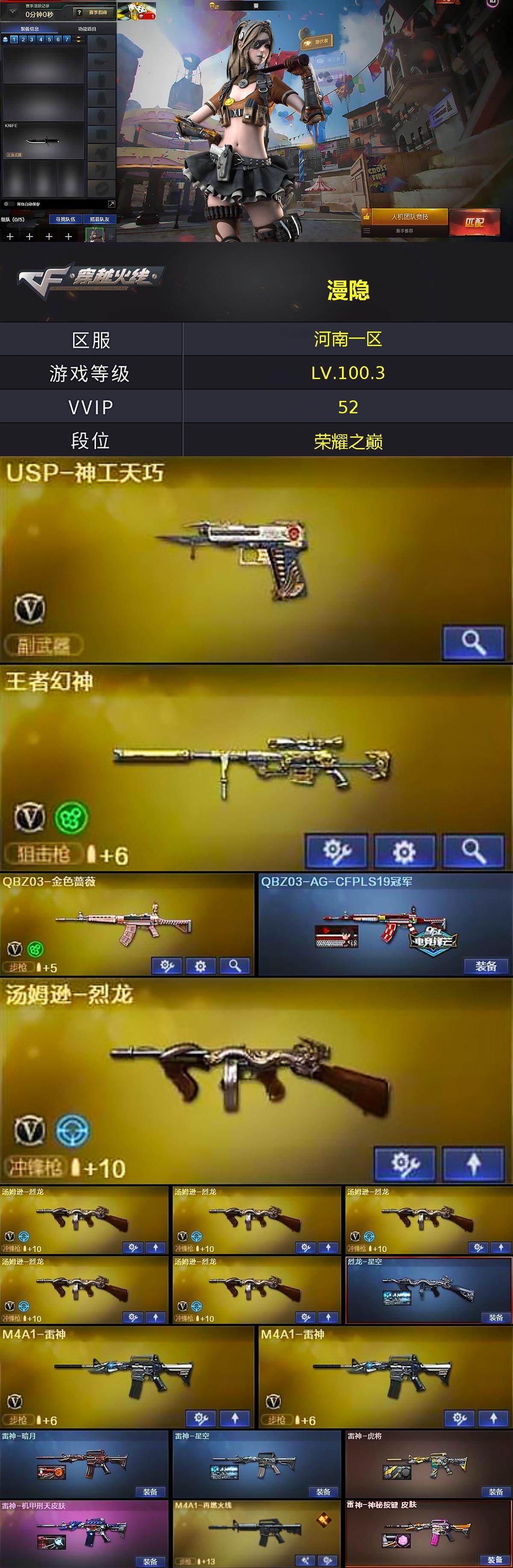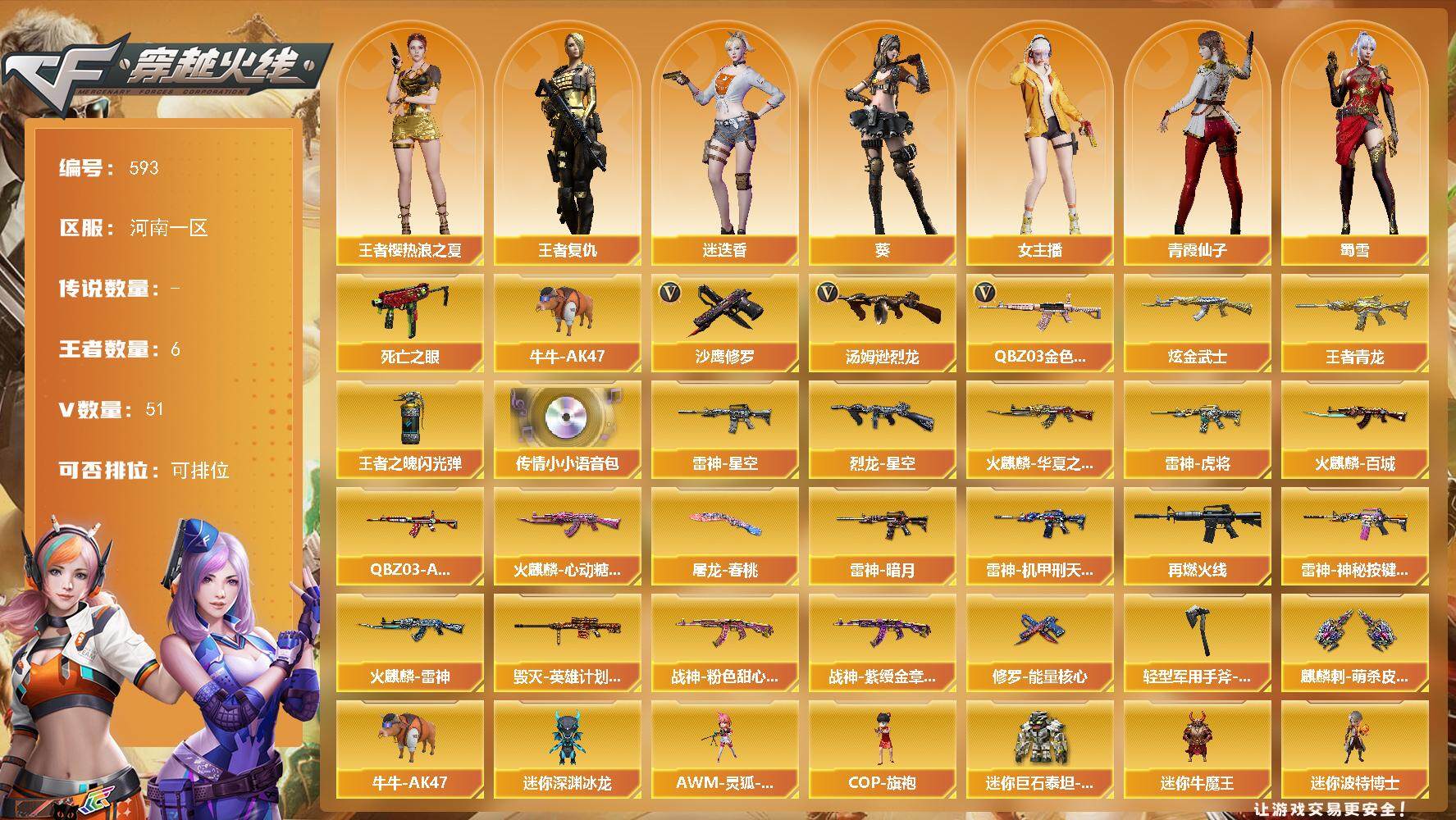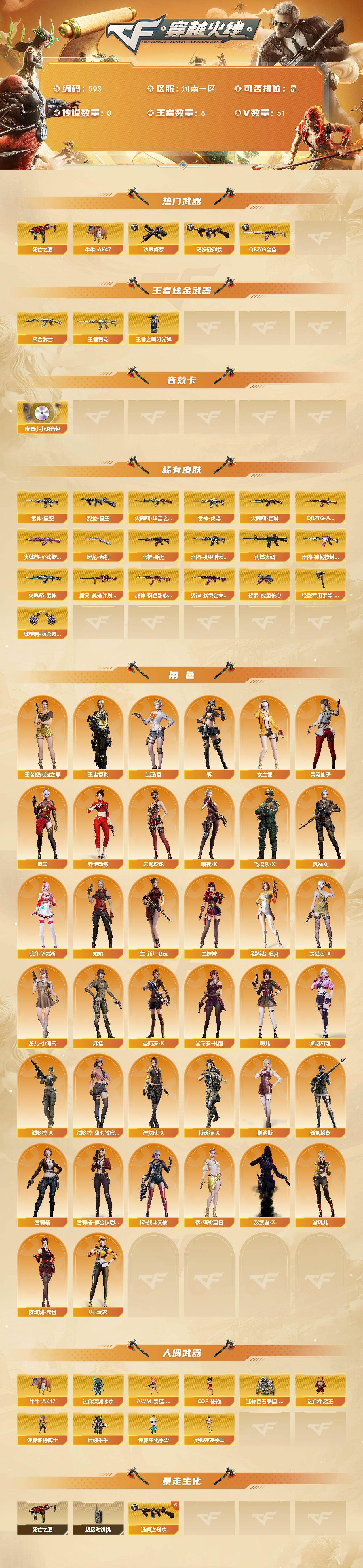 [15035188]河南一区-51V-6王者-1炫金 【热门武器】:QBZ03-金色蔷薇,死亡之眼*2,牛牛-AK47,汤姆逊-烈龙*6,沙鹰-修罗*5 【王者炫金武器】:王者青龙,炫金武士,王者之魄闪光弹 【音效卡】:传情小小语音包 【皮肤】:QBZ03-AG-CFPLS19冠军,烈龙-星空,雷神-暗月,雷神-星空,雷神-虎将,雷神-机甲刑天皮肤,M4A1-再燃火线,雷神-神秘按键 皮肤,火麒麟-雷神,火麒麟-华夏之心,火麒麟-百城,火麒麟-心动糖果,毁灭-英雄计划 皮肤,战神-粉色甜心皮肤,战神-紫绶金章皮肤*2,修罗-能量核心,屠龙-春桃 皮肤,轻型军用手斧-再燃火线,麒麟刺-萌杀皮肤 【角色】:葵,迷迭香,王者樱-热浪之夏,王者复仇,乔伊教练,云海玲珑,暗夜-X,飞虎队-X,风暴女,嘉年华灵狐,娟娟,兰-新年限定,兰妹妹,猎狐者-追月,0号玩家,灵狐者-X,龙儿-小淘气,麻雀,曼陀罗-X,曼陀罗-礼服,萌儿,娜塔莉娅,女主播,潘多拉-X,潘多拉-甜心教官,潜龙队-X,青霞仙子,斯沃特-X,蜀雪,维纳斯,新娜塔莎,雪莉杨,雪莉杨-摸金校尉,夜玫瑰-宠粉,樱-战斗天使,樱-缤纷夏日,影武者-X,游珑儿 【人偶武器】:AWM-灵狐-15周年嘉年华*2,COP-旗袍,牛牛-AK47,迷你深渊冰龙*2,迷你牛魔王,迷你波特博士,迷你牛牛,迷你生化手雷,迷你巨石泰坦-魔花研究所,灵狐娃娃手雷 【暴走生化】:死亡之眼*2,超级对讲机 【挑战大师】:激光毁灭者III-白马银枪*2,激光毁灭者III*2,神圣爆裂者-末日III 【英雄级武器】:AK47-火麒麟*2,M4A1-雷神*2,AK12-天启,M4A1-龙血,无影-神兵利器,黑武士-锦绣游龙,QBZ03-金色蔷薇,AK-47-猩红传说*3,黑武士-CF网剧冠军,Barrett-毁灭,王者幻神-觉醒版,王者森决-觉醒版,汤姆逊-烈龙*6,沙鹰-修罗*5,USP-神工天巧,天神-CF网剧冠军,屠龙,龙啸,马来剑-夜魔,擎天,麒麟刺,唐刀-神工天巧,斩神刀-雷暴,擎天-CF网剧冠军,麒麟刺-百战金芒,王者之啸-觉醒版,王者之击-觉醒版,高爆手雷-雷暴,高爆手雷-夜魔,高爆手雷-神工天巧,闪光弹-雷暴,闪光弹-夜魔,闪光弹-云龙,烟雾弹-雷暴,烟雾弹-夜魔,烟雾弹-神工天巧,M4A1-赤狱骑士 【道具】:CFS限定背包,云山科技背包,亚洲杯纪念