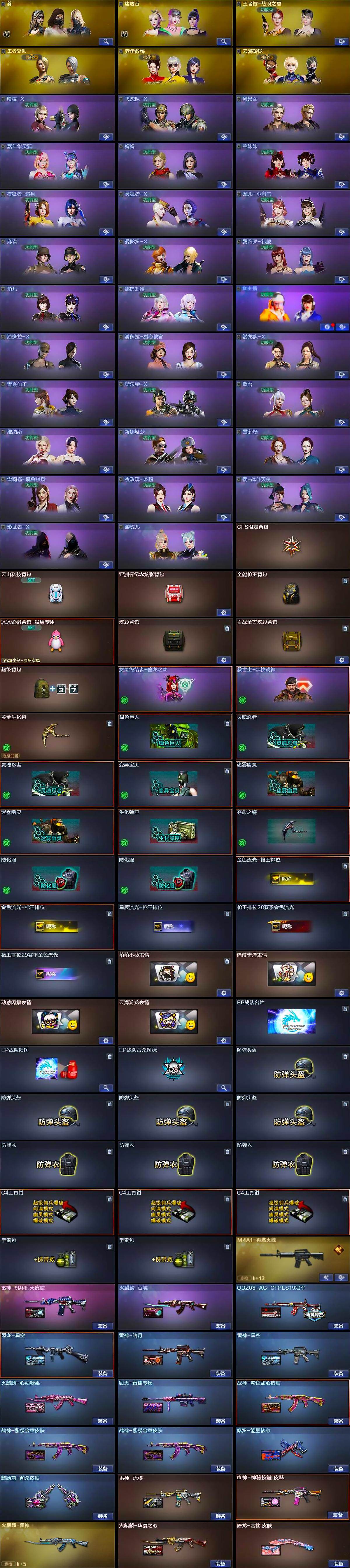 - [15532238]吉林一区-94V-8王者-3炫金 【热门武器】:QBZ03-金色蔷薇,HK417-朱雀,M200-幻神,白虎-电玩蓝兔,柯尔特-冠军之特,M4A1-黑骑士*3,汤姆逊-烈龙*9,RPK-盘龙*2,加特林-炼狱*2,斯泰尔-蝴蝶,沙鹰-修罗,Knife-冠军之刃 【王者炫金武器】:王者之戮,王者龙血,炫金毁灭,炫金修罗*2 【音效卡】:M4A1-黑龙音效卡,M4A1-黑骑士音效卡,Barrett-碧霄极光音效卡,炼狱-百战金芒-庆典舞曲音效卡,沙鹰-修罗-盛典舞曲音效卡 【皮肤】:幻神-动感闪耀 皮肤,幻神-AG-CFPL S24冠军 皮肤,QBZ03-冠军之薇,QBZ03-AG-CFPLS19冠军,金色蔷薇-纸灯龙皮肤,裁决-巅峰荣耀 皮肤,裁决-羽掣 皮肤,雷神-冠军之魄,雷神-R.LGD-CFPLS18冠军,雷神-宇航兔皮肤,雷神-诺拉 皮肤,M4A1-再燃火线,火麒麟-巅峰荣耀,火麒麟-心动糖果,毁灭耀金皮肤,毁灭-冠军之怒,黑骑士-冠军之势,死神-机甲核心皮肤,AK47-B-常胜将军-刘备,轻型军用手斧-再燃火线,擎天-冠军之击 【角色】:樱,玄豹,战地猎狐,王者涂鸦,王者-魅影,王者潘多拉,奇洋探员,乔伊教练,云海玲珑,北极狐-X,娟娟,卡塔琳娜,兰-新年限定,灵动武士,灵狐者-X,灵狐者-黄金海岸,龙儿,麻雀,潘多拉-X,潜龙队-X,青霞仙子,斯沃特-X,蜀雪,铁骑荣耀,兔囡囡,维纳斯,新娜塔莎,雪莉杨,影武者-X,智影,雅典娜 【人偶武器】:异变清道夫-蛇影双骄,斯泰尔-蝴蝶,COP-旗袍,迷你超能女侍 【暴走生化】:超级对讲机 【挑战大师】:神圣爆裂者III,激光毁灭者III 【英雄级武器】:AK47-火麒麟*2,M4A1-黑龙,M4A1-雷神,M4A1-黑骑士*3,M4A1-死神,AK47-黑武士*2,AK12-天启,AN94-超新星,M4A1-武圣,AK47-黑鲨,HK417-朱雀,SCAR Light-玄豹,M4A1-玫瑰精灵,QBZ03-金色蔷薇,烈火-动感闪耀,王者之翼-觉醒版,王者之魄-觉醒版,王者之幻-觉醒版,AK-47-猩红传说*2,王者炎心-觉醒版,黑骑士-海王,白虎-电玩蓝兔,王者芳薇-觉醒版,AWM-天龙,Barrett-毁灭*2,Barrett-极光,AWM-裁决*3,M200-幻神,RPK-盘龙*2,加特林-炼狱*2,炼狱