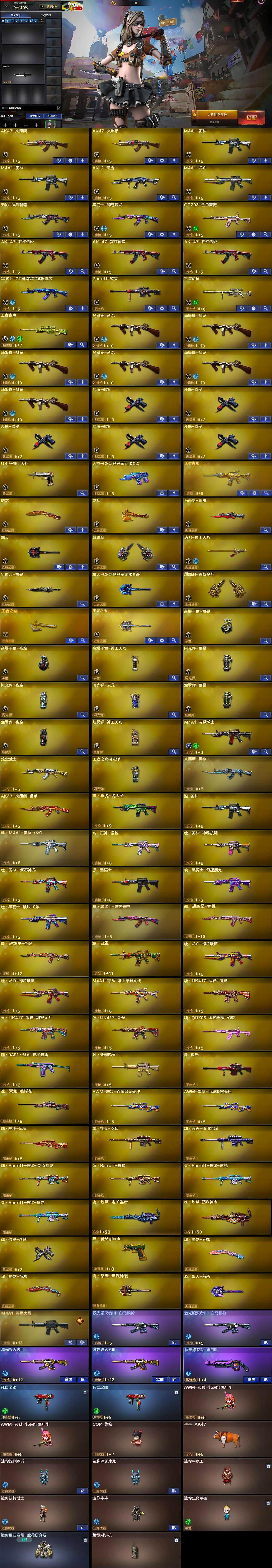 【英雄级武器】:AK47-火麒麟*2,M4A1-雷神*2,AK12-天启,M4A1-龙血,无影-神兵利器,黑武士-锦绣游龙,QBZ03-金色蔷薇,AK-47-猩红传说*3,黑武士-CF网剧冠军,Barrett-毁灭,王者幻神-觉醒版,王者森决-觉醒版,汤姆逊-烈龙*6,沙鹰-修罗*5,USP-神工天巧,天神-CF网剧冠军,屠龙,龙啸,马来剑-夜魔,擎天,麒麟刺,唐刀-神工天巧,斩神刀-雷暴,擎天-CF网剧冠军,麒麟刺-百战金芒,王者之啸-觉醒版,王者之击-觉醒版,高爆手雷-雷暴,高爆手雷-夜魔,高爆手雷-神工天巧,闪光弹-雷暴,闪光弹-夜魔,闪光弹-云龙,烟雾弹-雷暴,烟雾弹-夜魔,烟雾弹-神工天巧,M4A1-赤狱骑士