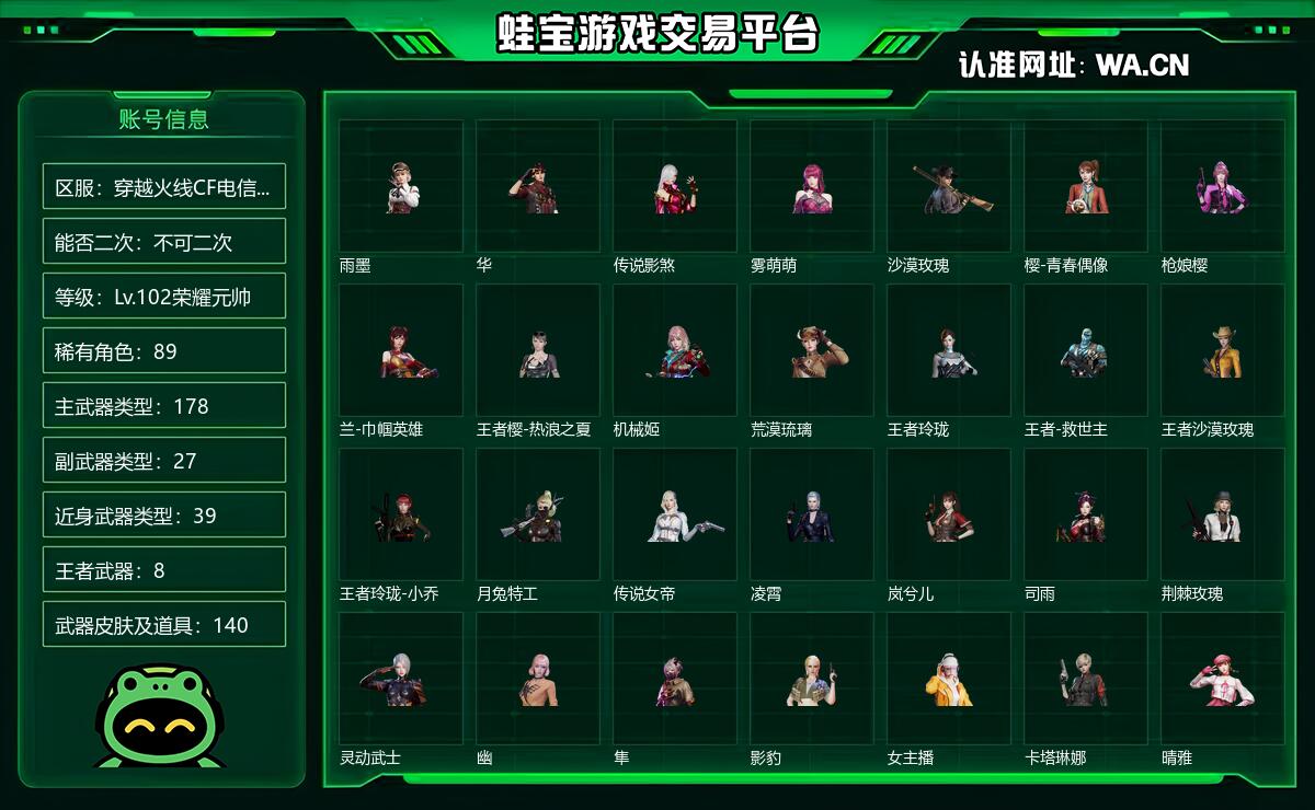 穿越火线CF电信区 不可二次 当前段位Lv.102荣耀元帅 点券84 稀有角色89 主武器类型178 副武器类型27 近身武器类型39 王者武器8 武器皮肤及道具140 其他1284