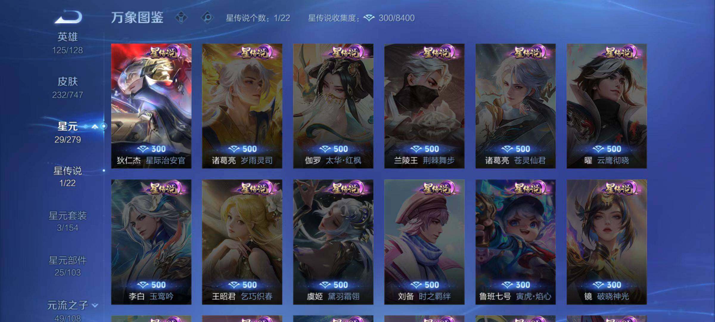 【赛季限定】:白起狰,芈月重明,夏侯惇朔风刀,曹操烛龙,典韦穷奇,狄仁杰万华元夜,达摩沙漠行僧,老夫子醍醐杖,程咬金演武夺筹,兰陵王金庭之子,张良古海寻踪,牛魔御旌,李元芳云中旅人,钟馗驱傩正仪,雅典娜黎明之约,太乙真人饕餮,鬼谷子原初探秘者,苏烈千军破阵,百里玄策原初追逐者,弈星混沌棋,梦奇顽趣,沈梦溪大漠名商,明世隐疑决卦,裴擒虎擒涛扼浪,狂铁御狮,米莱狄御霄,盾山御銮,鲁班大师探海日志,桑启海盐诗旅,鬼谷子天穹祈灯,蒙恬荣光圣徽,刘邦剑破天穹,姜子牙天穹之誓