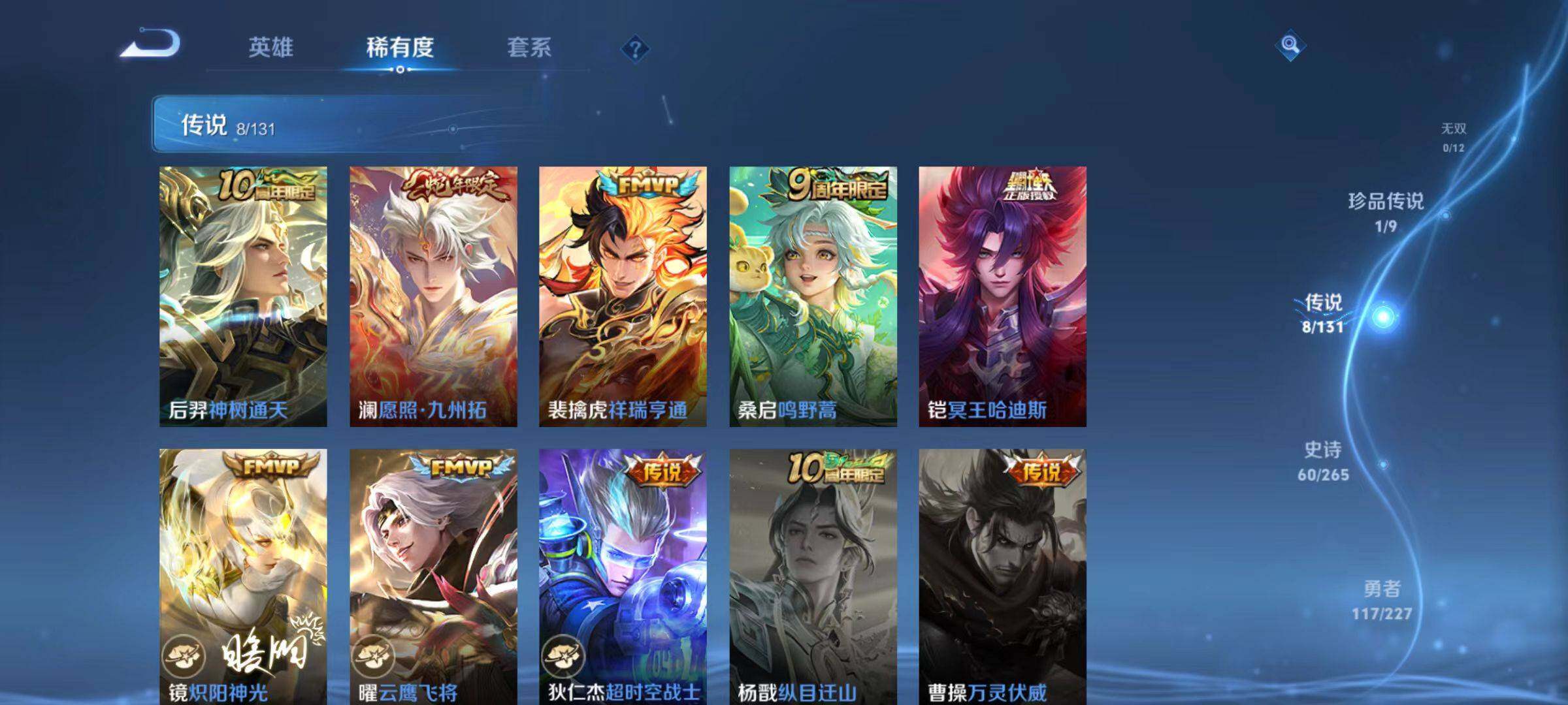 【传说皮肤】:后羿神树通天,澜愿照九州拓,裴擒虎祥瑞亨通,桑启鸣野蒿,铠冥王哈迪斯,镜炽阳神光,曜云鹰飞将,狄仁杰超时空战士