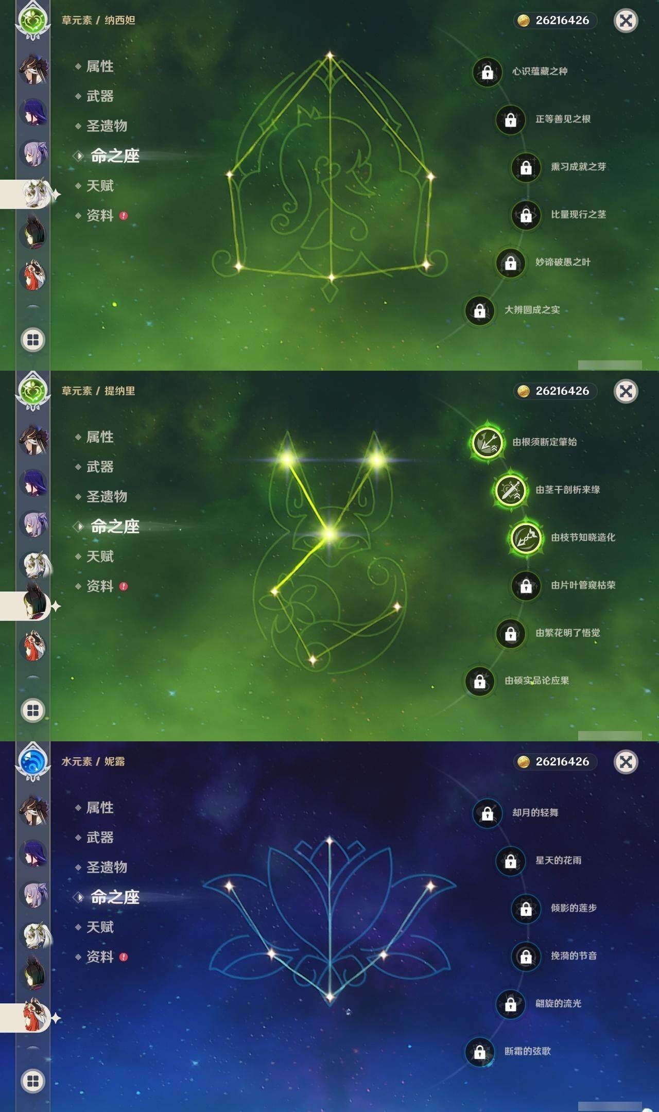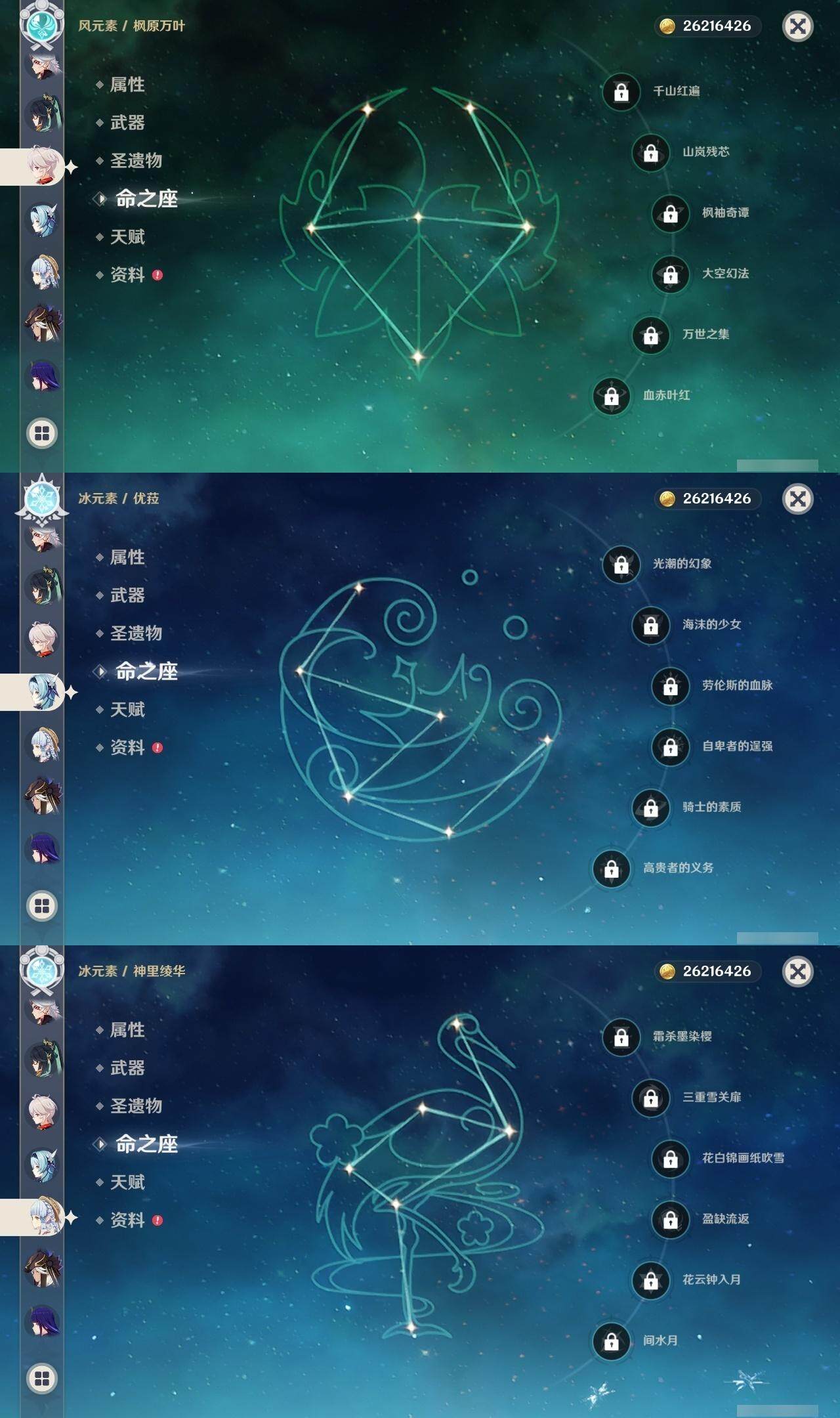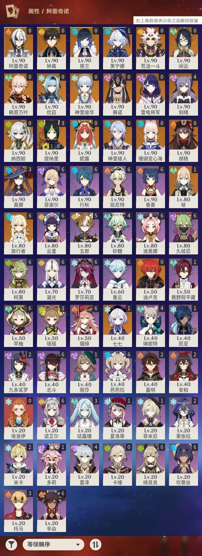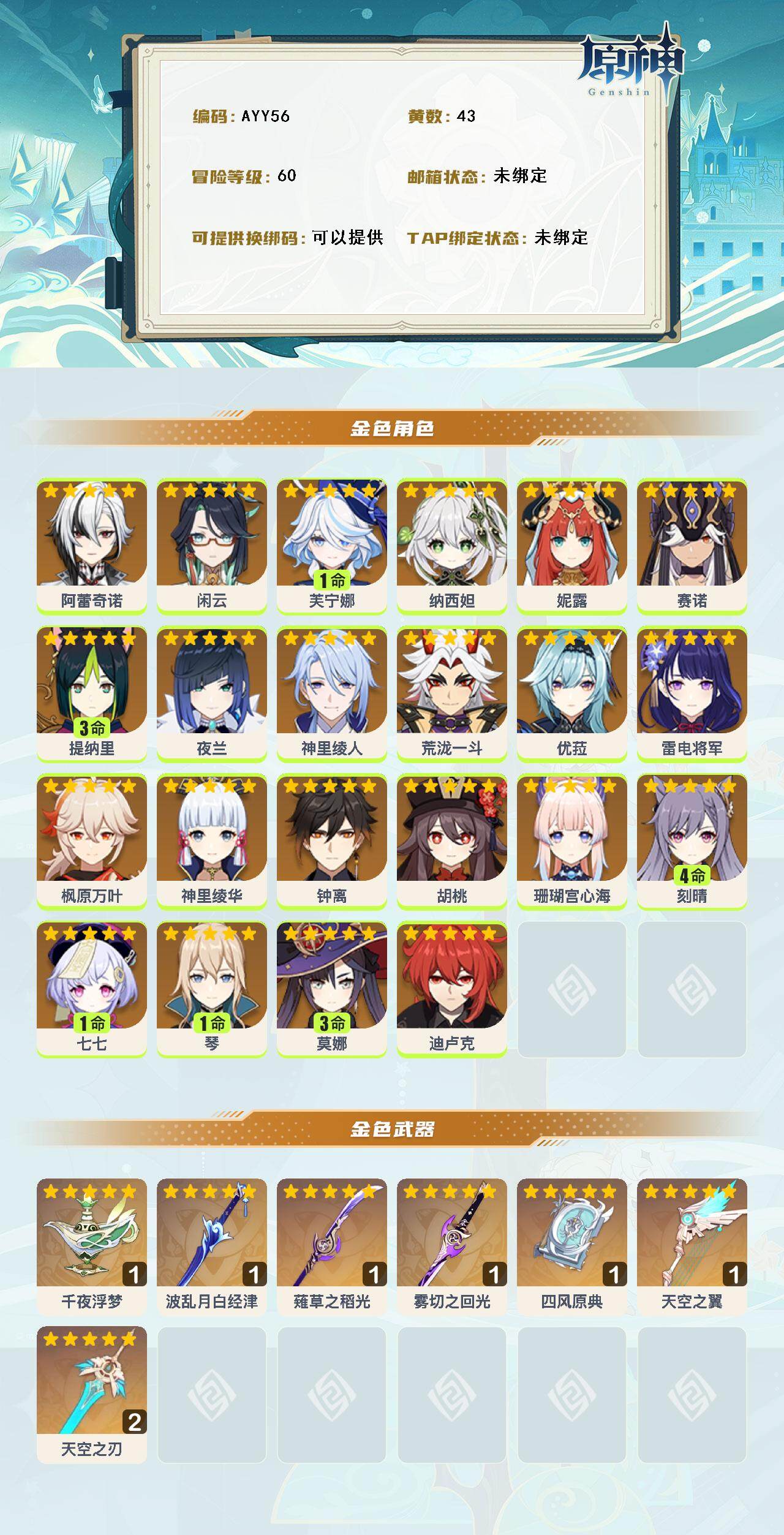 0命阿蕾奇诺,0命闲云,1命芙宁娜,0命纳西妲,0命妮露,0命赛诺,3命提纳里,0命夜兰,0命神里绫人,0命荒泷一斗,0命优菈,0命雷电将军,0命枫原万叶,0命神里绫华,0命钟离,0命胡桃,0命珊瑚宫心海,4命刻晴,1命七七,1命琴,3命莫娜,0命迪卢克,精1千夜浮梦,精1波乱月白经津,精1薙草之稻光,精1雾切之回光,精1四风原典,精1天空之翼,精2天空之刃
