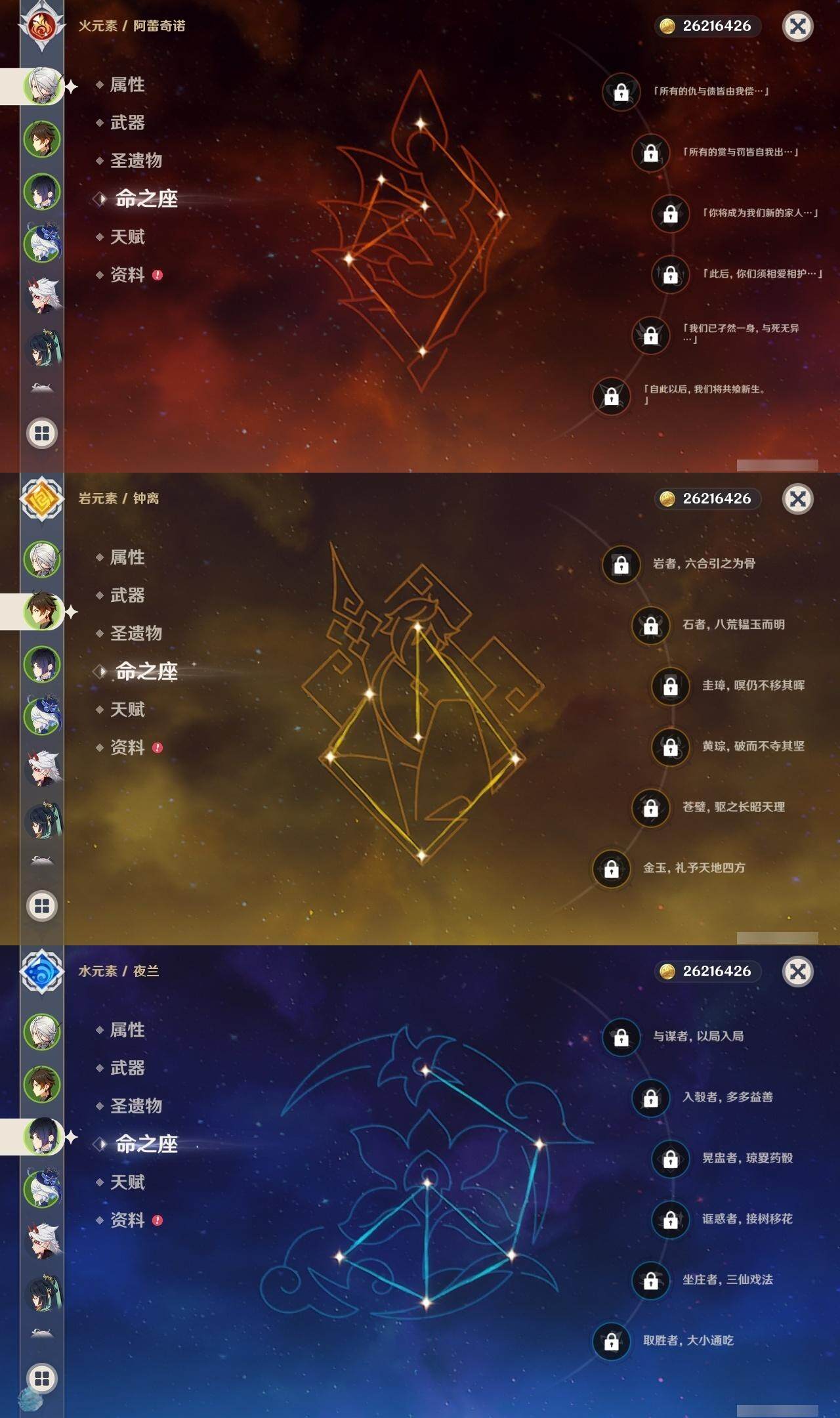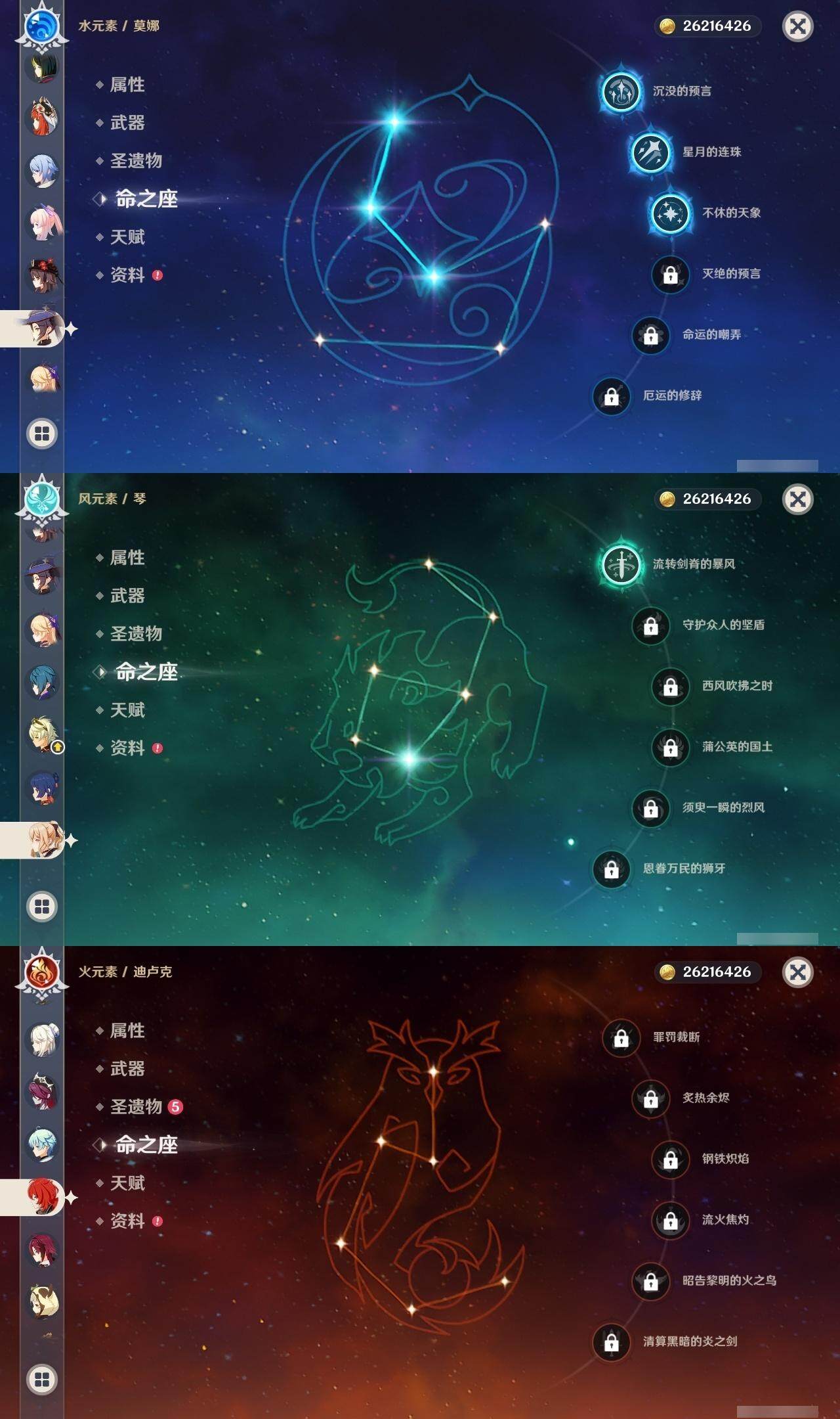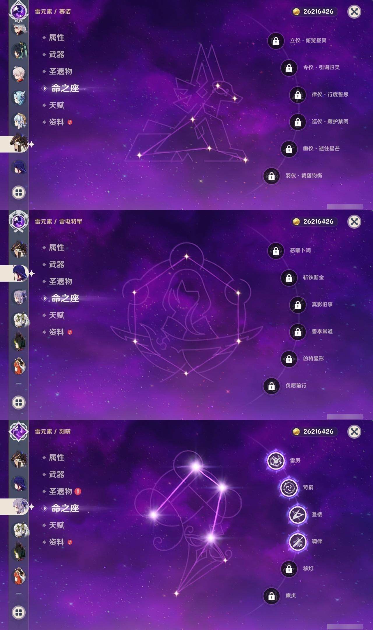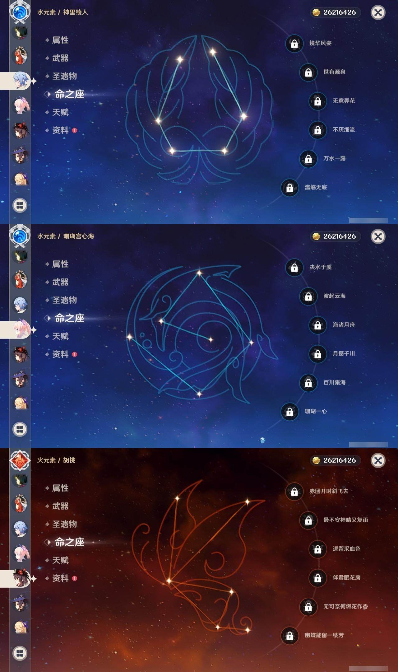0命阿蕾奇诺,0命闲云,1命芙宁娜,0命纳西妲,0命妮露,0命赛诺,3命提纳里,0命夜兰,0命神里绫人,0命荒泷一斗,0命优菈,0命雷电将军,0命枫原万叶,0命神里绫华,0命钟离,0命胡桃,0命珊瑚宫心海,4命刻晴,1命七七,1命琴,3命莫娜,0命迪卢克,精1千夜浮梦,精1波乱月白经津,精1薙草之稻光,精1雾切之回光,精1四风原典,精1天空之翼,精2天空之刃