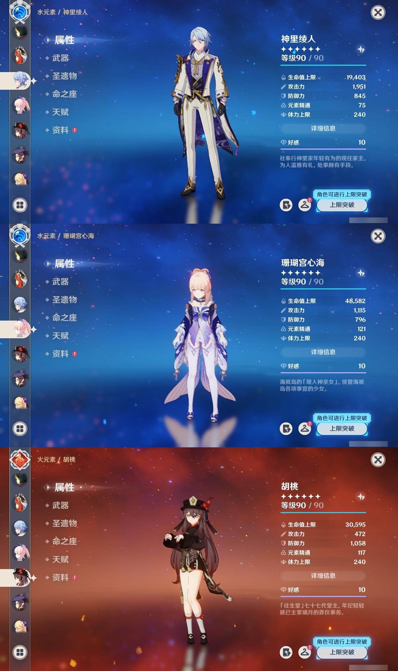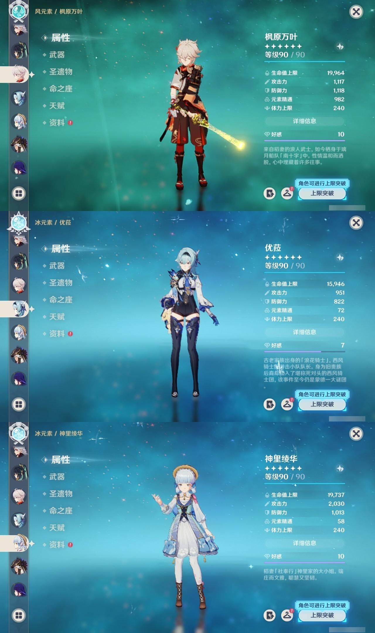钟离,荒泷一斗,枫原万叶,优菈,神里凌华,雷电将军,刻晴,珊瑚宫心海,胡桃,莫娜,琴,迪卢克,七七