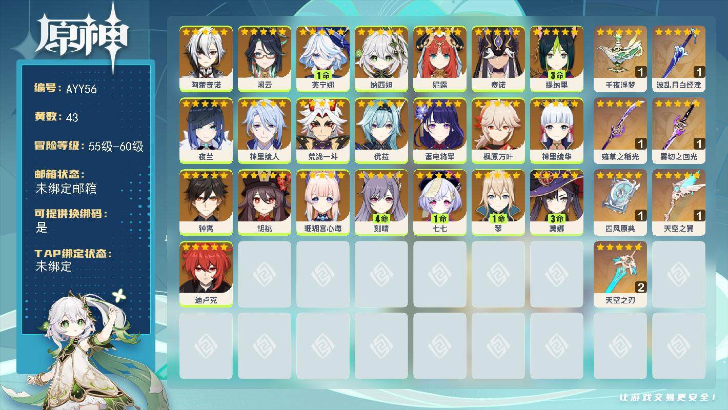 [14744425]60级/43黄/女主/22个五星角色/7个五星武器 0命阿蕾奇诺,0命闲云,1命芙宁娜,0命纳西妲,0命妮露,0命赛诺,3命提纳里,0命夜兰,0命神里绫人,0命荒泷一斗,0命优菈,0命雷电将军,0命枫原万叶,0命神里绫华,0命钟离,0命胡桃,0命珊瑚宫心海,4命刻晴,1命七七,1命琴,3命莫娜,0命迪卢克,精1千夜浮梦,精1波乱月白经津,精1薙草之稻光,精1雾切之回光,精1四风原典,精1天空之翼,精2天空之刃