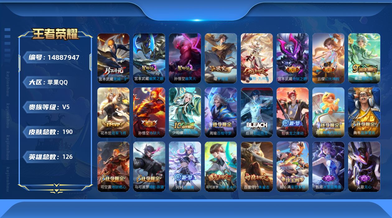 - [12667149]安卓Q-V4-最强王者段位-125英雄-133皮肤-0典藏-0珍品无双-0无双-0珍品传说-5传说-41史诗 【传说皮肤】:桑启鸣野蒿,李信山海炽霜斩,马超无双飞将,镜炽阳神光,干将莫邪久胜战神 【限定皮肤】:狄仁杰阴阳师,赵云皇家上将,钟无艳超时空战士,元歌无心,甄姬落雪兰心,马可波罗山海玄木吟,狄仁杰魔术师,达摩沙漠行僧,项羽海滩派对,兰陵王金庭之子,李元芳云中旅人,干将莫邪胡桃夹子,雅典娜黎明之约,鬼谷子五谷丰年,百里玄策原初追逐者,梦奇顽趣,沈梦溪大漠名商,裴擒虎擒涛扼浪,云中君纤云弄巧,李信山海炽霜斩,鲁班大师探海日志,桑启海盐诗旅,阿古朵江河有灵,张良古海寻踪,蒙恬荣光圣徽,高渐离燃音魔法,妲己灵卜魔法,鬼谷子天穹祈灯,百里玄策超元猎域,刘邦剑破天穹,程咬金群星魔术团,刘备异域游侠 【年限皮肤】:马可波罗山海玄木吟,李信山海炽霜斩 【赛季限定】:达摩沙漠行僧,兰陵王金庭之子,张良古海寻踪,李元芳云中旅人,雅典娜黎明之约,百里玄策原初追逐者,梦奇顽趣,沈梦溪大漠名商,裴擒虎擒涛扼浪,鲁班大师探海日志,桑启海盐诗旅,鬼谷子天穹祈灯,蒙恬荣光圣徽,刘邦剑破天穹 【战令限定】:钟无艳超时空战士,甄姬落雪兰心,高渐离燃音魔法,妲己灵卜魔法 【史诗皮肤】:赵云皇家上将,貂蝉圣诞恋歌,王昭君偶像歌手,狄仁杰魔术师,宫本武藏鬼剑武藏,孙尚香水果甜心,妲己魅力维加斯,妲己女仆咖啡,墨子金属风暴,李白千年之狐,吕布末日机甲,张飞乱世虎臣,花木兰水晶猎龙者,夏侯惇乘风破浪,小乔缤纷独角兽,百里守约特工魅影,李元芳逐浪之夏,程咬金功夫厨神,白起星夜王子,孙策猫狗日记,狄仁杰鹰眼统帅,不知火舞魅语,百里玄策原初追逐者,云中君纤云弄巧,杨戬天秀启明,雅典娜黎明之约,钟无艳超时空战士,鬼谷子五谷丰年,元歌无心,梦奇顽趣,马可波罗山海玄木吟,阿古朵江河有灵,妲己灵卜魔法,高渐离燃音魔法,蒙恬荣光圣徽,百里玄策超元猎域,亚连破空之剑,牛魔星界战将,刘禅鸭鸭历险记,后羿石田雨龙,黄忠百相守梦,西施织梦人 【其他皮肤】:项羽海滩派对,韩信街头霸王,赵云忍炎影,白起白色死神,宫本武藏未来纪元,孙膑天使之翼,典韦黄金武士,亚瑟死亡骑士,达摩拳王,花木兰兔女郎,张飞五福同心,甄姬花好人间,刘备万事如意,狄仁杰阴阳师,刘备纽约教父,刘备汉昭烈帝,关羽龙腾万里,孙尚香沉稳之力,鬼谷子幻乐之宴,苏烈坚