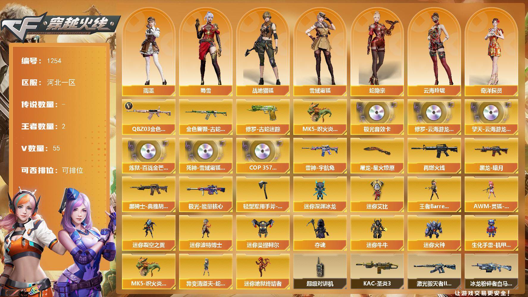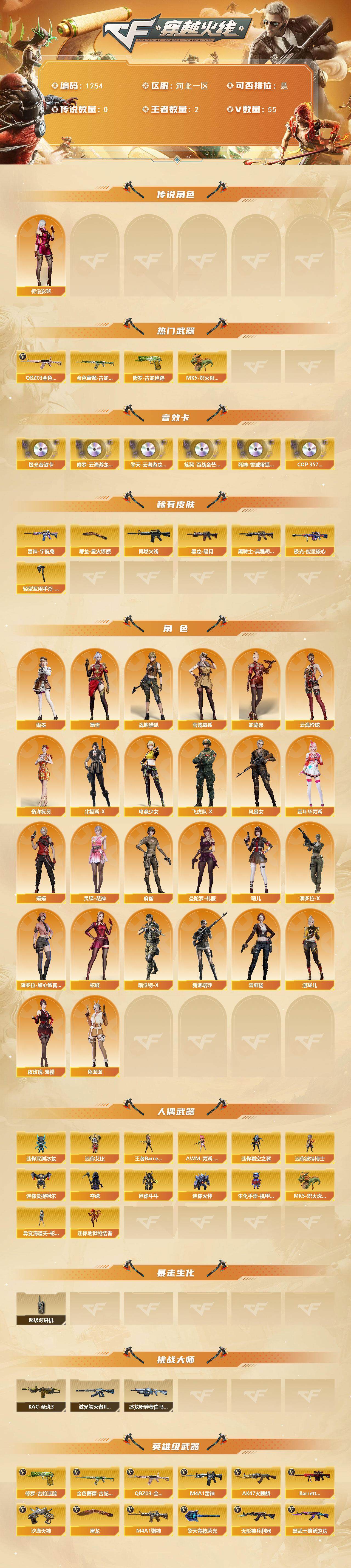- [15245965]陕西一区-78V-22王者-4炫金 【热门武器】:QBZ03-金色蔷薇,HK417-朱雀,M4A1-青龙,M200-幻神,死亡之眼,M4A1-黑骑士,汤姆逊-烈龙*6,RPK-盘龙*5,加特林-炼狱*3,沙鹰-修罗*5,柯尔特-赛博朋克 【王者炫金武器】:王者之戮,王者之幻,王者之武,王者之影,炼狱-悦蓝,王者之灵*2,王者之锋,炫金毁灭,炫金天龙,炫金修罗*2 【音效卡】:M200-幻神音效卡,AK47-火麒麟音效卡,M4A1-雷神音效卡,M4A1-黑骑士音效卡,Barrett-毁灭音效卡*2 【皮肤】:幻神-宠儿-2021MVP,白虎-AG-CFPLS20冠军,雷神-荣耀之魄,雷神-星空,AK47-火麒麟-传奇EVEN,火麒麟-战神关羽*2,火麒麟-心动糖果,黑龙-墨子皮肤,黑骑士-地狱火,战神-粉色甜心皮肤,战神-流金岁月皮肤,AK47-B-常胜将军-刘备*2,AK47-B-常胜将军-孙权*2,AWM-天龙-传奇70KG,修罗-能量核心*2,擎天-冠军之击,麒麟刺-甜蜜糖果 皮肤 【角色】:樱,魅影,关小雨,王者-瞳-闭月羞花,王者涂鸦,乔伊教练,空,暗夜-X,初恋灵狐,电竞少女,芳心审判者,风暴女,嘉年华灵狐,荆棘玫瑰,兰-空鹰,零-热舞青春,潘多拉-X,潘多拉-甜心教官,斯沃特-X,铁骑荣耀,新娜塔莎,影武者-X,职业选手,雅典娜 【人偶武器】:火麒麟-灵狐*2,M4A1-雷神-精英刀锋,AWM-灵狐-15周年嘉年华,COP-旗袍,迷你裂空之翼*4,夺魂*2,迷你牛牛,深渊终结者手雷,闪光弹-小乔,闪光弹-貂蝉,高爆手雷-大乔,迷你艾比 【暴走生化】:死亡之眼,超级对讲机 【挑战大师】:神圣爆裂者III,冰龙粉碎者-白马银枪,激光毁灭者III-白马银枪,VEPR-12-金魔,激光毁灭者III,阐释者III*2 【英雄级武器】:AK47-火麒麟*2,M4A1-黑龙,M4A1-雷神*2,M4A1-黑骑士,AN94-超新星,M4A1-龙血,M4A1-青龙,HK417-朱雀,无影-神兵利器,黑武士-锦绣游龙,QBZ03-金色蔷薇,烈火-动感闪耀,王者之魄-觉醒版,王者之势-觉醒版,AK-47-猩红传说*2,王者炎心-觉醒版,黑骑士-海王,AK47-B-常胜将军,Barrett-毁灭,Barrett-极光,AWM-裁决,M200-幻神,王者之力-觉醒版,RPK-盘