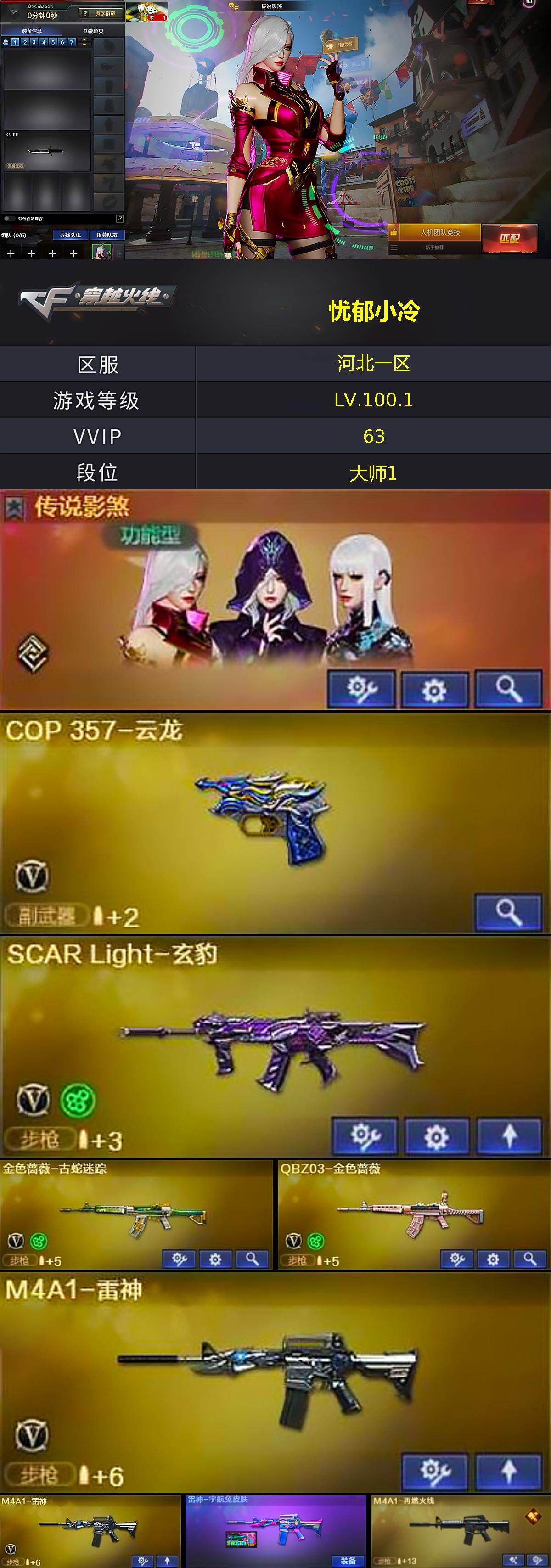 [15053139]河北一区-55V-2王者-0炫金 【传说角色】:传说影煞 【热门武器】:QBZ03-金色蔷薇,金色蔷薇-古蛇迷踪,修罗-古蛇迷踪,MK5-炽火炎龙 【音效卡】:修罗-云海游龙音效卡,擎天-云海游龙音效卡,Barrett-极光音效卡,炼狱-百战金芒-庆典舞曲音效卡,死神-雪域霜狐-怀旧音效卡,COP 357-雪域霜狐-怀旧音效卡 【皮肤】:雷神-宇航兔皮肤,M4A1-再燃火线,黑龙-暗月,黑骑士