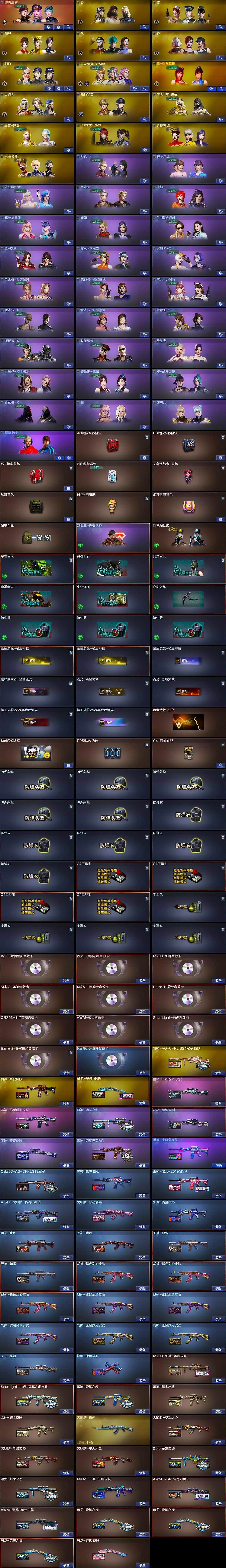 【皮肤】:M200-幻神-黄忠皮肤,幻神-冠军之幻,幻神-AG-CFPL S24冠军 皮肤,ScarLight-白虎-冠军之虎皮肤,QBZ03-AG-CFPLS19冠军,裁决-羽掣 皮肤,裁决-叶芒苍灵 皮肤,星神-璀璨皮肤,雷神-能量核心,雷神-荣耀之魄,雷神-耀金皮肤*2,雷神-宠儿-2019MVP,雷神-烈虎皮肤,雷神-荣耀世冠AG,雷神-机甲刑天皮肤,雷神-宇航兔皮肤,火麒麟-雷神,火麒麟-华夏之心*2,AK47-火麒麟-传奇EVEN,火麒麟-平天大圣,火麒麟-心动糖果,毁灭-荣耀之怒,毁灭-冠军之怒,M4A1-千变-孔明皮肤,黑龙-能量核心,黑龙-暗月,无影-暗月,死神-秘银*2,战神-粉色甜心皮肤*3,战神-紫绶金章皮肤*3,战神-流金岁月皮肤*2,AK47-B-常胜将军-曹操,AK47-B-常胜将军-刘备,天龙-秘银,AWM-天龙-传奇70KG,AWM-天龙-传奇白鲨,修罗-能量核心,屠龙-荣耀之锋*3,屠龙-星耀 皮肤,屠龙-春桃 皮肤