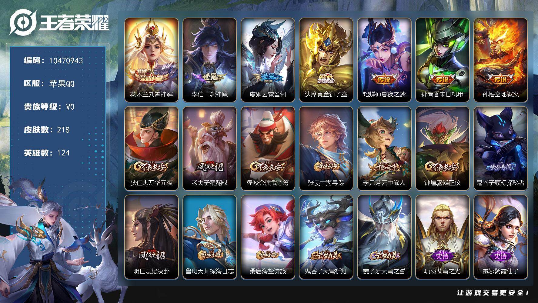 - [12088115]V8 1无双 3珍品传说 24传说 125英雄 249皮肤 可修改实名 女号 优质装备:小乔时之魔女(小乔无双),大耳狗之梦,黄金狮子座,黄金射手座,云鹰飞将(小将军),绛天战甲(鸡嘴战神),炽阳神光,一念神魔,末日机甲-孙尚香(绿蚂蚱),仲夏夜之梦(大飞蛾),音你心动-小乔,地狱之眼,飞鸢探春,音你心动-周瑜,胖达荣荣,乞巧织情,时之恋人-刘备(电焊工),游龙清影(小青龙),花朝如约(花篮子),无双飞将,音你闪耀(rap皮) 珍品传说:时之奇旅-孙策,兔狲·蓬尾 传说皮:幻光神枪 限定皮:愿照·山河定(司空震年限),愿照·千秋盛(女娲年限),神威(电光马子),怒海麟威,冰锋战神,梁祝,烈魂,李小龙 史诗皮:鸭鸭历险记-刘禅,器灵·浮梦炉,化蝶舞,龙之律动,茶境仙,百相守梦-黄忠,紫霞仙子,苍穹之光,电玩小子(小书包),黄金分割率,特工魅影,千年之狐,永昼,浮梦罗烟,魅语,偶像歌手,白蛇,电玩·爆裂旋风,龙骑士(小龙虾),乱世虎臣,节奏热浪,修罗,女仆咖啡,水果甜心,天才门将,星夜王子,功夫厨神,德古拉伯爵,暗隐猎兽者,幽灵船长,舞动绿茵,地狱岩魂,繁星吟游(呼啦呼啦),缤纷独角兽,乘风破浪,水晶猎龙者,金属风暴,原初追逐者,圣诞狂欢,圣诞恋歌,鹰眼统帅,魅力维加斯,未来纪元-赵云