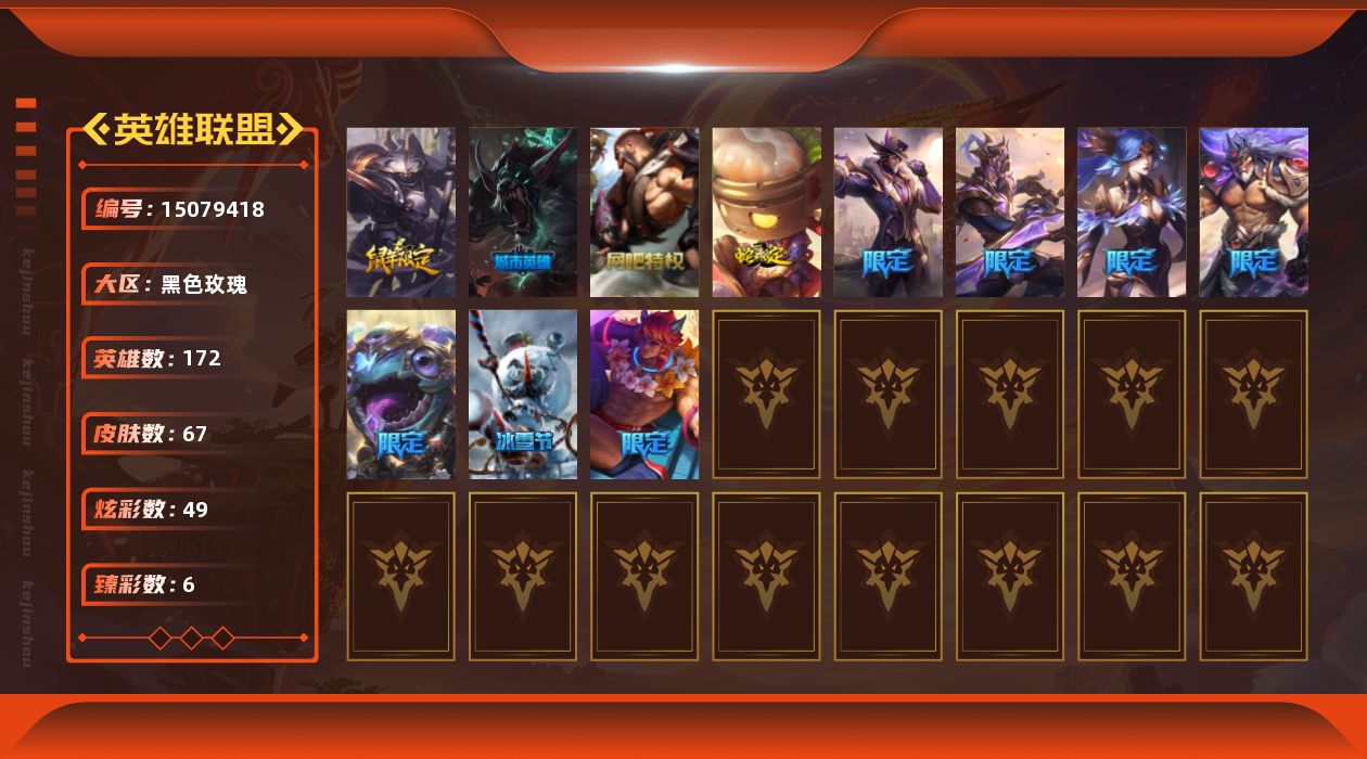 [15079418]钻石段位-172英雄-67皮肤-49炫彩-0终极-0神话-15限定-6传说-6史诗