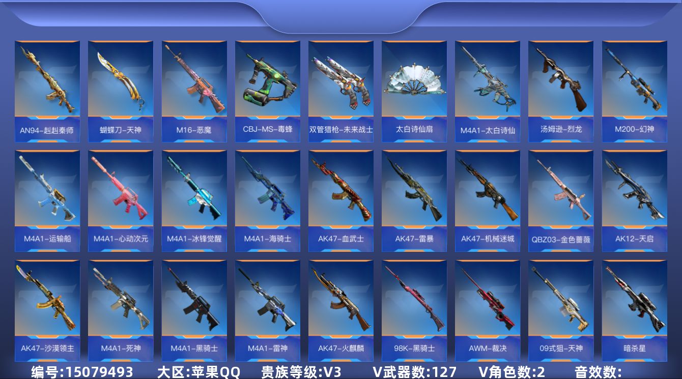 [15079493]【特价出售/店主推荐】2英雄角色数-125英雄武器数 【热门武器】:M200-幻神,81式-阿波罗 【角色】:春节兰-X,炽天使-X 【英雄武器】:AK47-火麒麟*2,AK47-沙漠领主,AK47-机械迷城,AK47-雷暴,AK47-血武士,AK47-木兰*2,AK47-谜城烟火,M4A1-雷神,M4A1-黑骑士,M4A1-死神,M4A1-海骑士,M4A1-冰锋觉醒,M4A1-心动次元,M4A1-运输船*2,M4A1-太白诗仙,SCAR-探星者,AN94-赳赳秦师,M16-恶魔*2,AK12-天启,QBZ03-金色蔷薇,AWM-裁决,AWM-指南针,AWM-大湾溢彩,巴雷特-毁灭*3,巴雷特-极光,巴雷特-朱雀,暗杀星,M200-幻神,09式狙-天神,98K-黑骑士,加特林-堡垒*2,QBB95-极光,汤姆逊-烈龙*2,CBJ-MS-毒蜂,地狱火,KSG-钟馗觉醒,USP-太白诗仙,沙鹰-修罗*2,改装GLOCK-木兰,GLOCK18-猎神*2,QSZ92-华夏传说,双管猎枪-未来战士,蝴蝶刀-天神,龙啸,神罚战斧,手斧-机械迷城,秋逸,秋逸觉醒,屠龙*4,太白诗仙扇,马来剑-毁灭,唐刀-华夏传说,唐刀-大唐荣耀,擎天觉醒,末日裁决觉醒*2