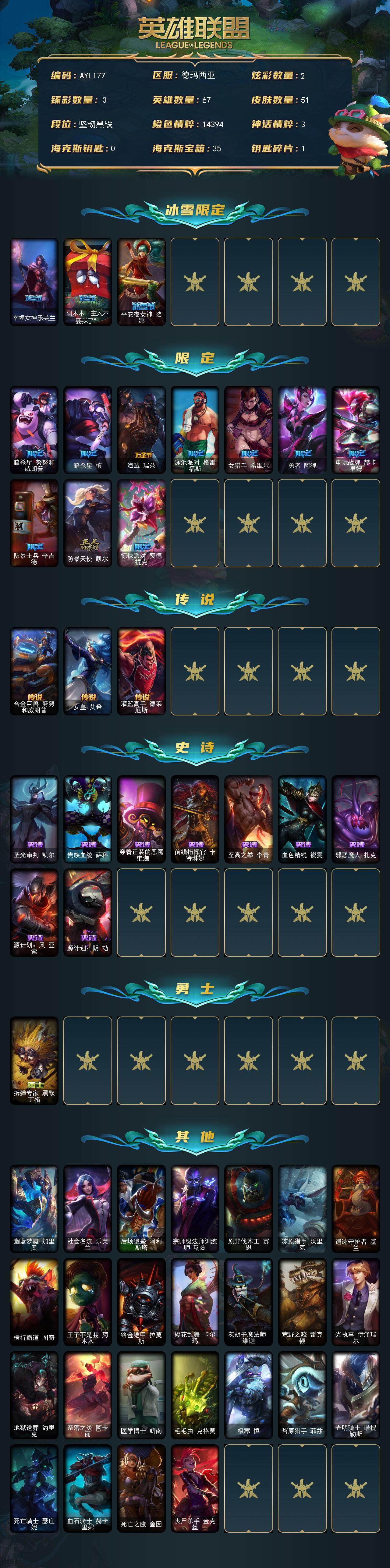 [15079547]【店主推荐捡漏号!可直接换绑】未定级段位-67英雄-51皮肤-2炫彩-0终极-0神话-13限定-3传说-9史诗 【冰雪限定】:幸福女神乐芙兰,阿木木“主人不要我了”,平安夜女神娑娜 【限定皮肤】:暗杀星努努和威朗普,暗杀星慎,海贼瑞兹,泳池派对格雷福斯,女猎手希维尔,勇者阿狸,电玩战魂赫卡里姆,防暴士兵辛吉德,防暴天使凯尔,惊悚派对费德提克 【传说皮肤】:合金巨兽努努和威朗普,女皇艾希,灌篮高手德莱厄斯 【史诗皮肤】:圣光审判凯尔,贵族血统萨科,穿着正装的恶魔维迦,前线指挥官卡特琳娜,至高之拳李青,血色精锐锐雯,邪恶魔人扎克,源计划风亚索,源计划阴劫 【勇士皮肤】:拆弹专家黑默丁格 【其他皮肤1】:幽蓝梦魇加里奥,社会名流乐芙兰,后场堡垒阿利斯塔,宗师级法师训练师瑞兹,原野伐木工赛恩,冻原猎手沃里克,遗迹守护者基兰,横行霸道图奇,王子不是我阿木木,铬金铠甲拉莫斯,樱花乱舞卡尔玛,灰胡子魔法师维迦,荒野之咬雷克顿,光执事伊泽瑞尔,地狱送葬约里克,奈落之炎阿卡丽,医学博士凯南,毛毛虫克格莫,极寒慎,苔原猎手菲兹,光明骑士诺提勒斯,死亡骑士瑟庄妮,血石骑士赫卡里姆,死亡之鹰奎因,丧尸杀手金克丝