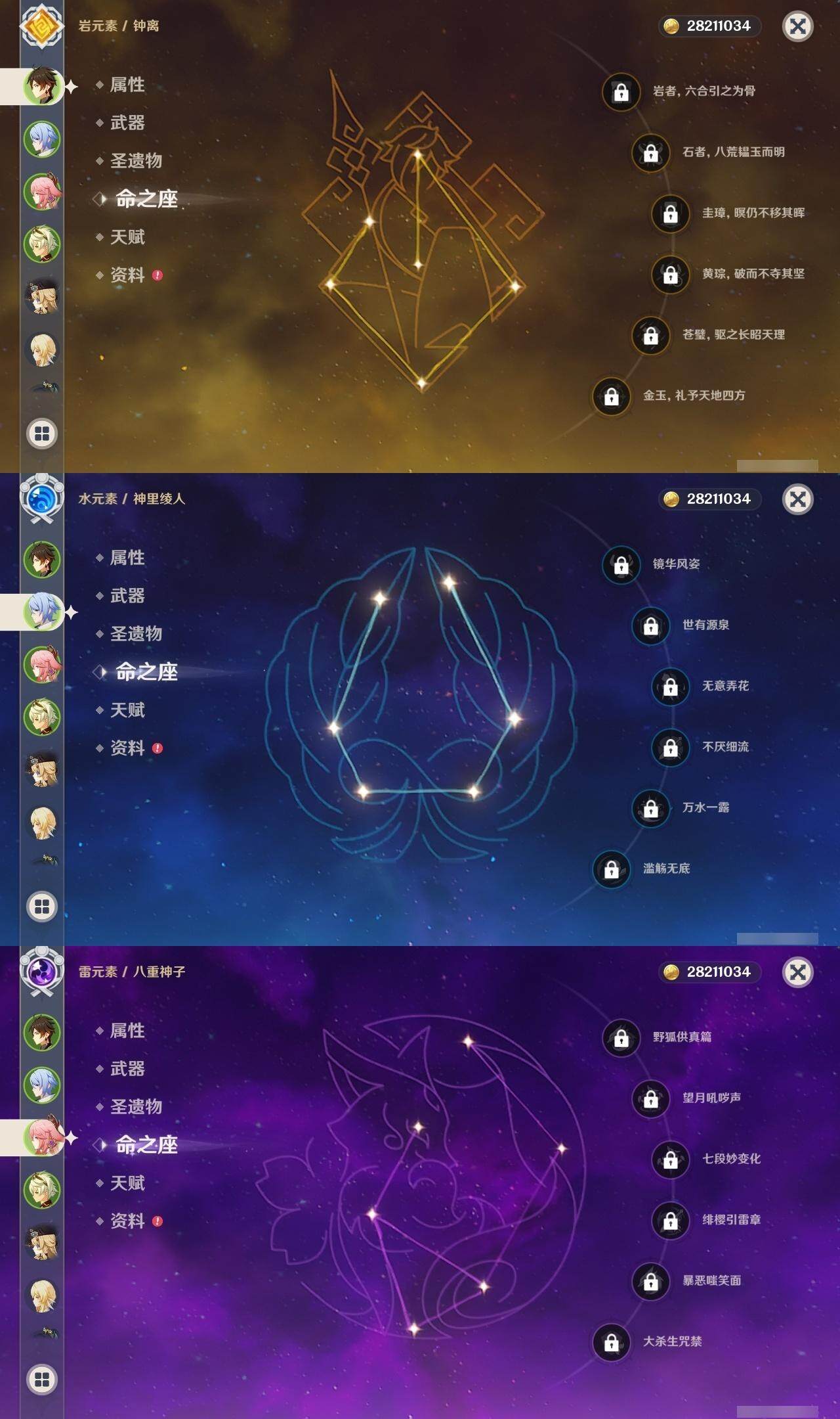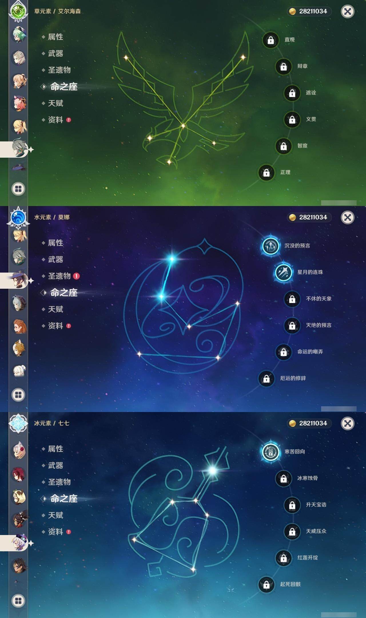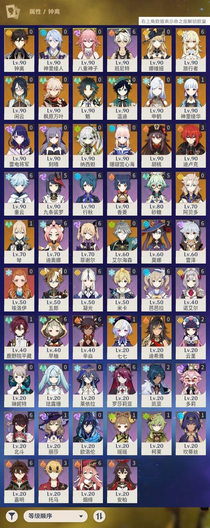 0命闲云,0命娜维娅,0命迪希雅,0命艾尔海森,0命纳西妲,0命神里绫人,0命八重神子,0命申鹤,0命雷电将军,0命枫原万叶,1命神里绫华,0命钟离,0命胡桃,0命魈,0命温迪,0命阿贝多,0命珊瑚宫心海,0命刻晴,1命七七,1命琴,2命莫娜,3命迪卢克,精1鹤鸣余音,精1千夜浮梦,精1波乱月白经津,精1不灭月华,精1雾切之回光,精1无工之剑,精1护摩之杖,精1磐岩结绿,精1和璞鸢,精1阿莫斯之弓,精1天空之卷,精1狼的末路,精1天空之傲