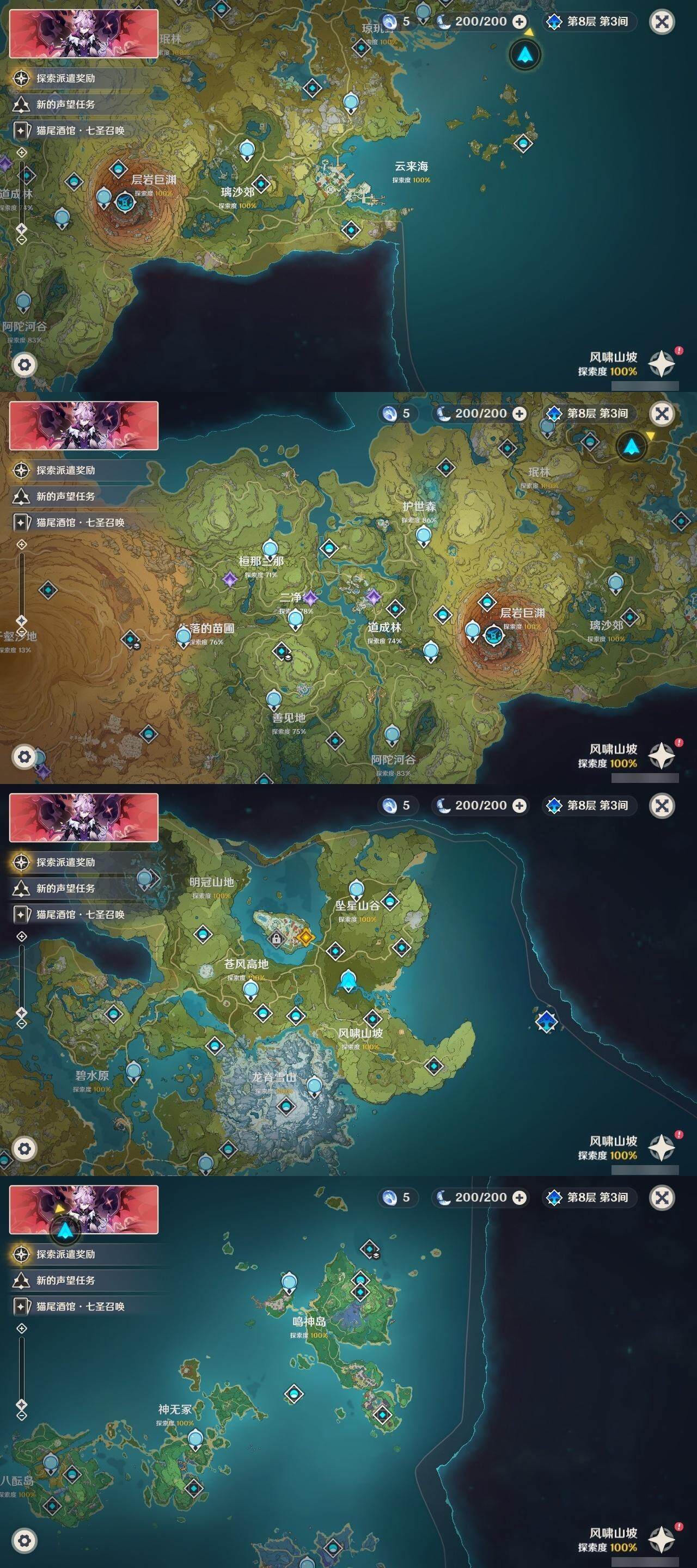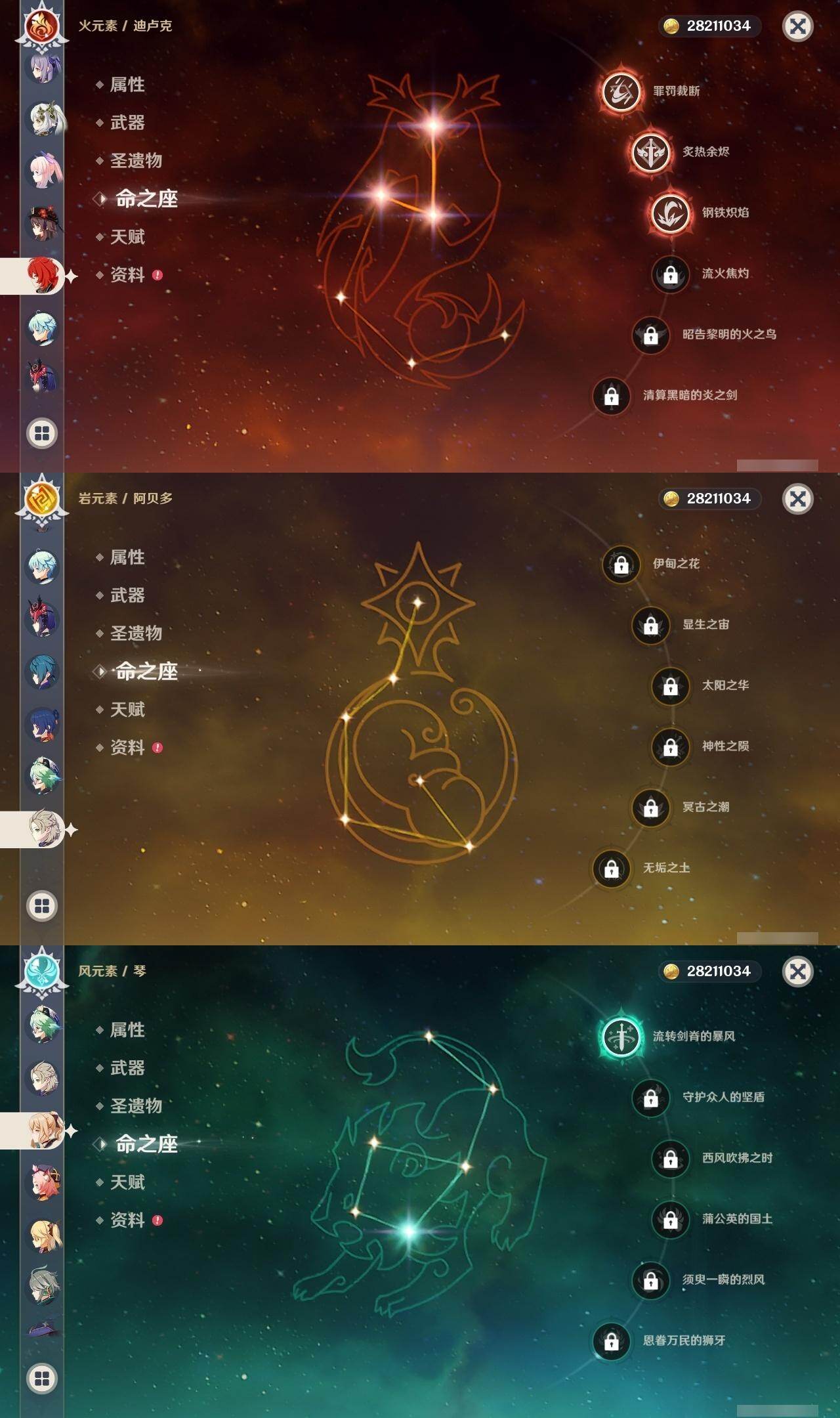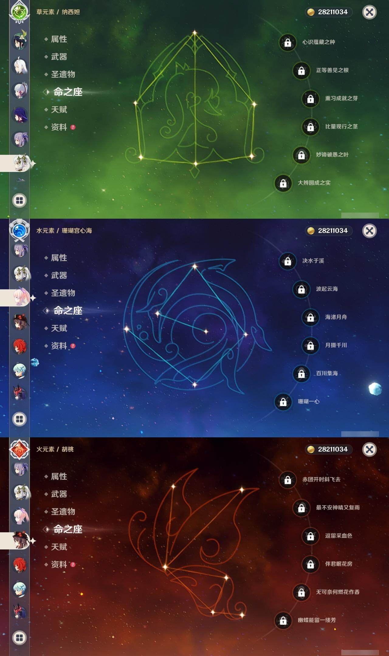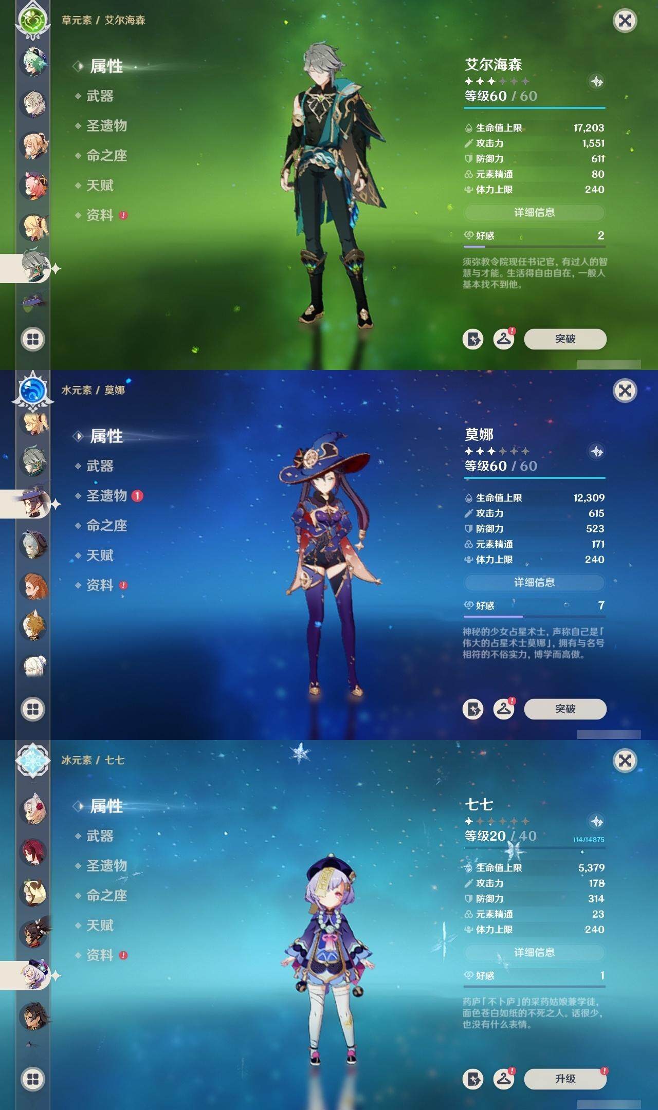 0命闲云,0命娜维娅,0命迪希雅,0命艾尔海森,0命纳西妲,0命神里绫人,0命八重神子,0命申鹤,0命雷电将军,0命枫原万叶,1命神里绫华,0命钟离,0命胡桃,0命魈,0命温迪,0命阿贝多,0命珊瑚宫心海,0命刻晴,1命七七,1命琴,2命莫娜,3命迪卢克,精1鹤鸣余音,精1千夜浮梦,精1波乱月白经津,精1不灭月华,精1雾切之回光,精1无工之剑,精1护摩之杖,精1磐岩结绿,精1和璞鸢,精1阿莫斯之弓,精1天空之卷,精1狼的末路,精1天空之傲
