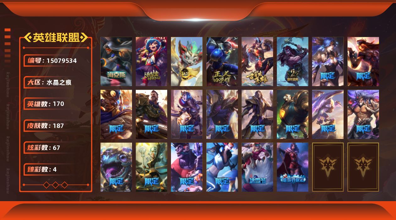 [15079534]可二次【特价出售/店主推荐】未定级段位-170英雄-187皮肤-67炫彩-0终极-3神话-22限定-20传说-50史诗