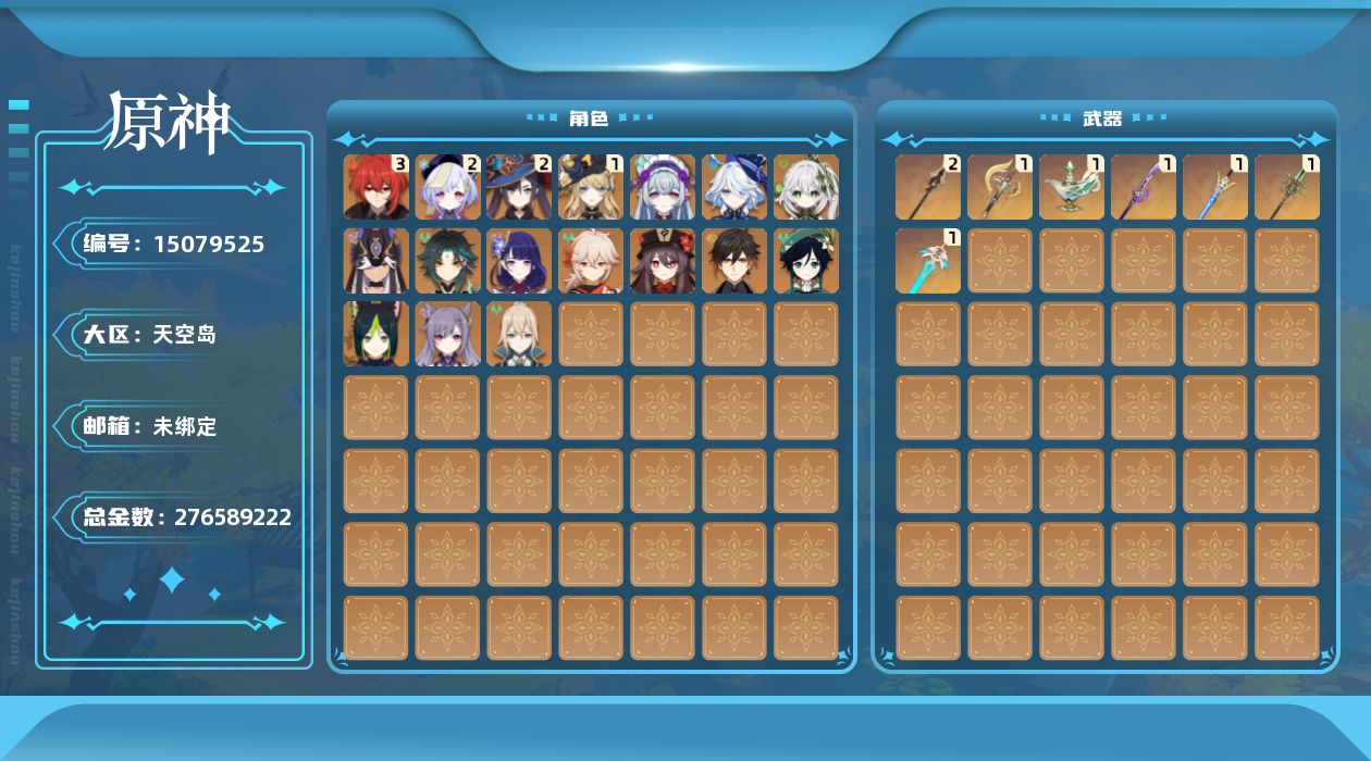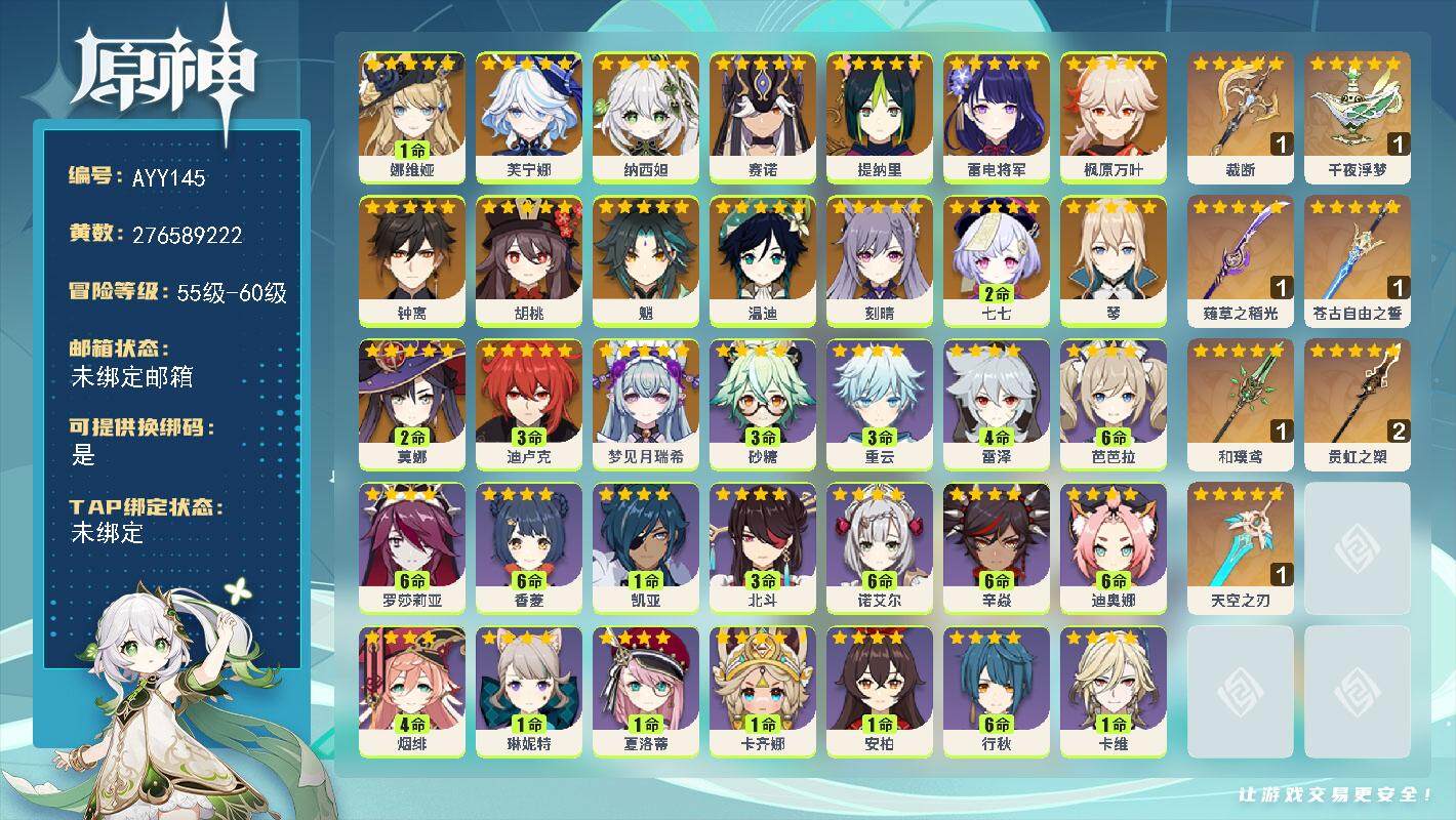 [15079525]【金色角色】:梦见月瑞希(0命),娜维娅(1命),芙宁娜(0命),纳西妲(0命),赛诺(0命),提纳里(0命),雷电将军(0命),枫原万叶(0命),胡桃(0命),魈(0命),钟离(0命),温迪(0命),琴(0命),刻晴(0命),迪卢克(3命),莫娜(2命),七七(2命) 【拥有武器】:裁断(精1),千夜浮梦(精1),薙草之稻光(精1),苍古自由之誓(精1),贯虹之槊(精2),和璞鸢(精1),天空之刃(精1) 【紫色角色】:雅珂达(0命),爱诺(0命),塔利雅(0命),伊法(2命),欧洛伦(0命),卡齐娜(1命),夏洛蒂(1命),琳妮特(0命),卡维(0命),米卡(0命),瑶瑶(1命),珐露珊(1命),莱依拉(0命),坎蒂丝(3命),多莉(0命),柯莱(4命),鹿野院平藏(2命),久岐忍(0命),云堇(0命),五郎(3命),托马(3命),九条裟罗(4命),早柚(4命),烟绯(4命),罗莎莉亚(满命),辛焱(满命),迪奥娜(满命),砂糖(3命),雷泽(4命),菲谢尔(0命),丽莎(1命),北斗(3命),香菱(满命),安柏(1命),班尼特(满命),行秋(满命),芭芭拉(满命),凝光(满命),诺艾尔(满命),凯亚(0命),重云(3命)