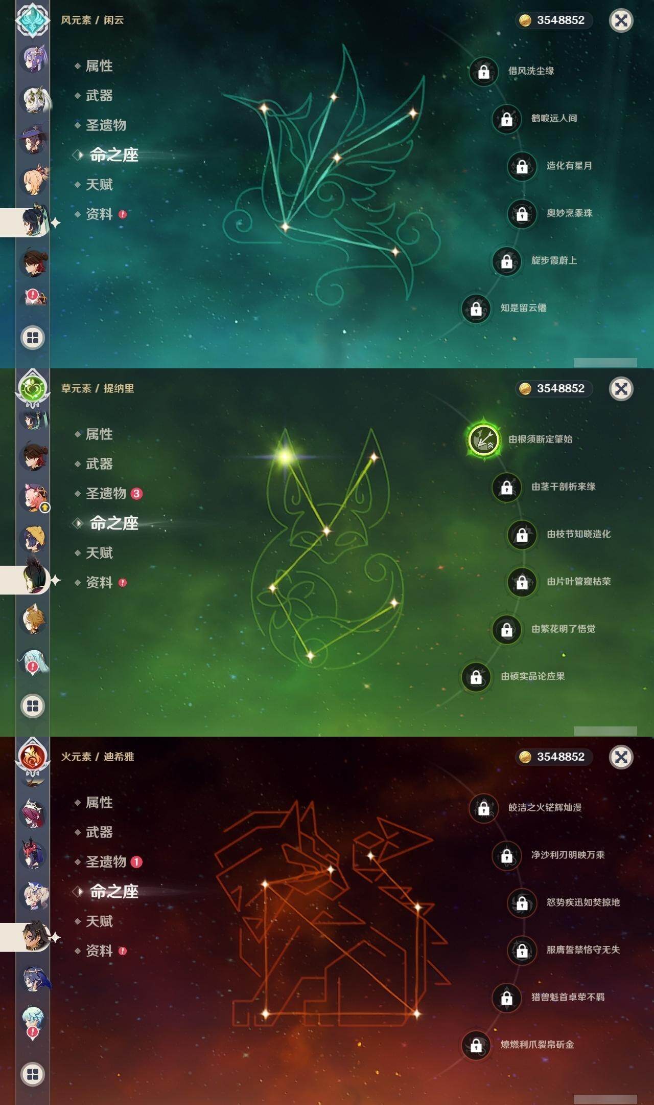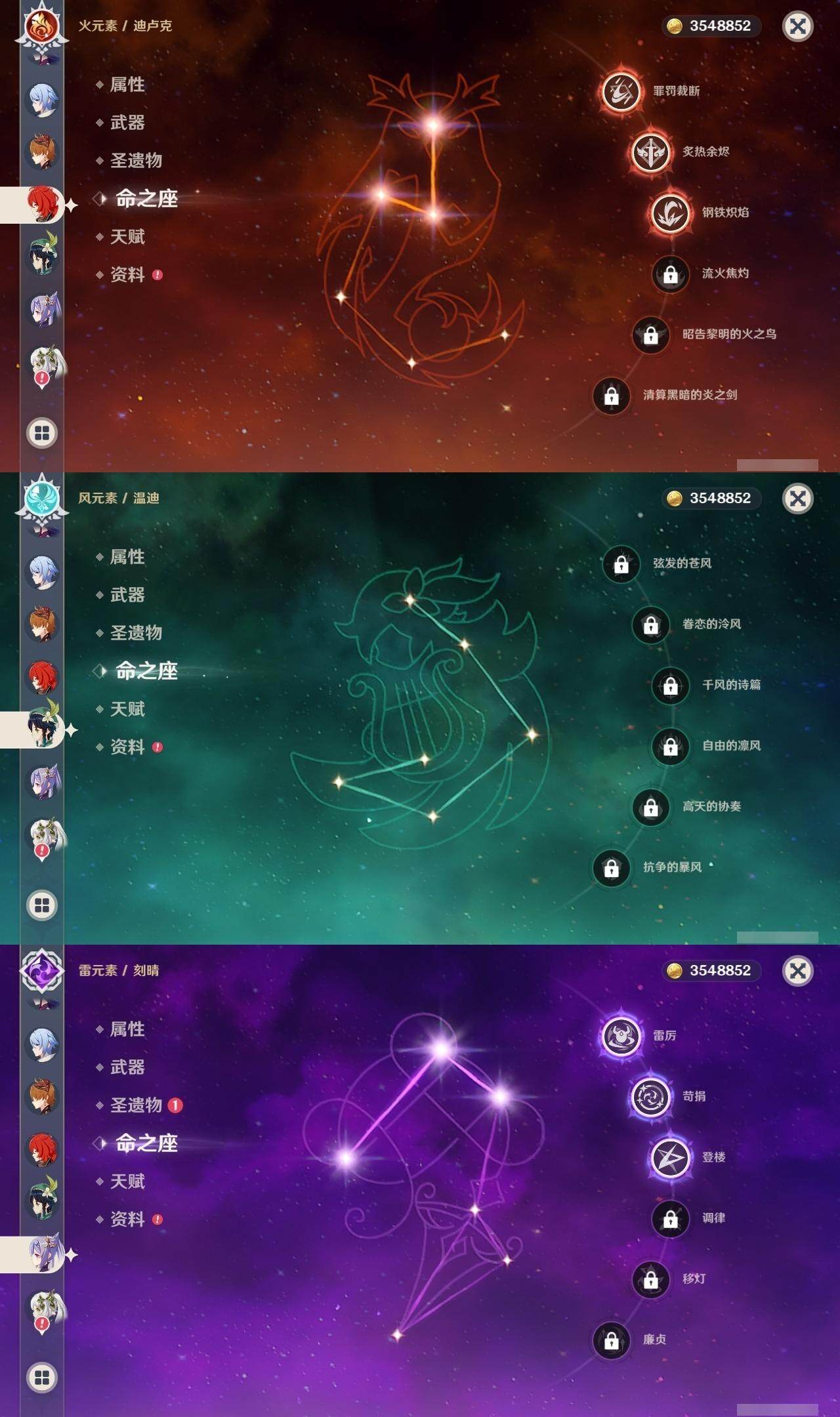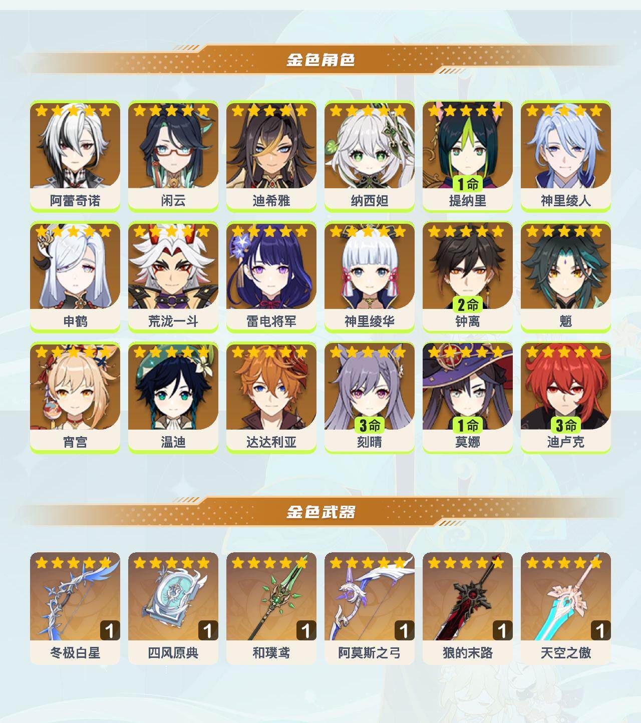0命阿蕾奇诺,0命闲云,0命迪希雅,0命纳西妲,1命提纳里,0命神里绫人,0命申鹤,0命荒泷一斗,0命雷电将军,0命神里绫华,2命钟离,0命魈,0命宵宫,0命温迪,0命达达利亚,3命刻晴,1命莫娜,3命迪卢克,精1冬极白星,精1四风原典,精1和璞鸢,精1阿莫斯之弓,精1狼的末路,精1天空之傲