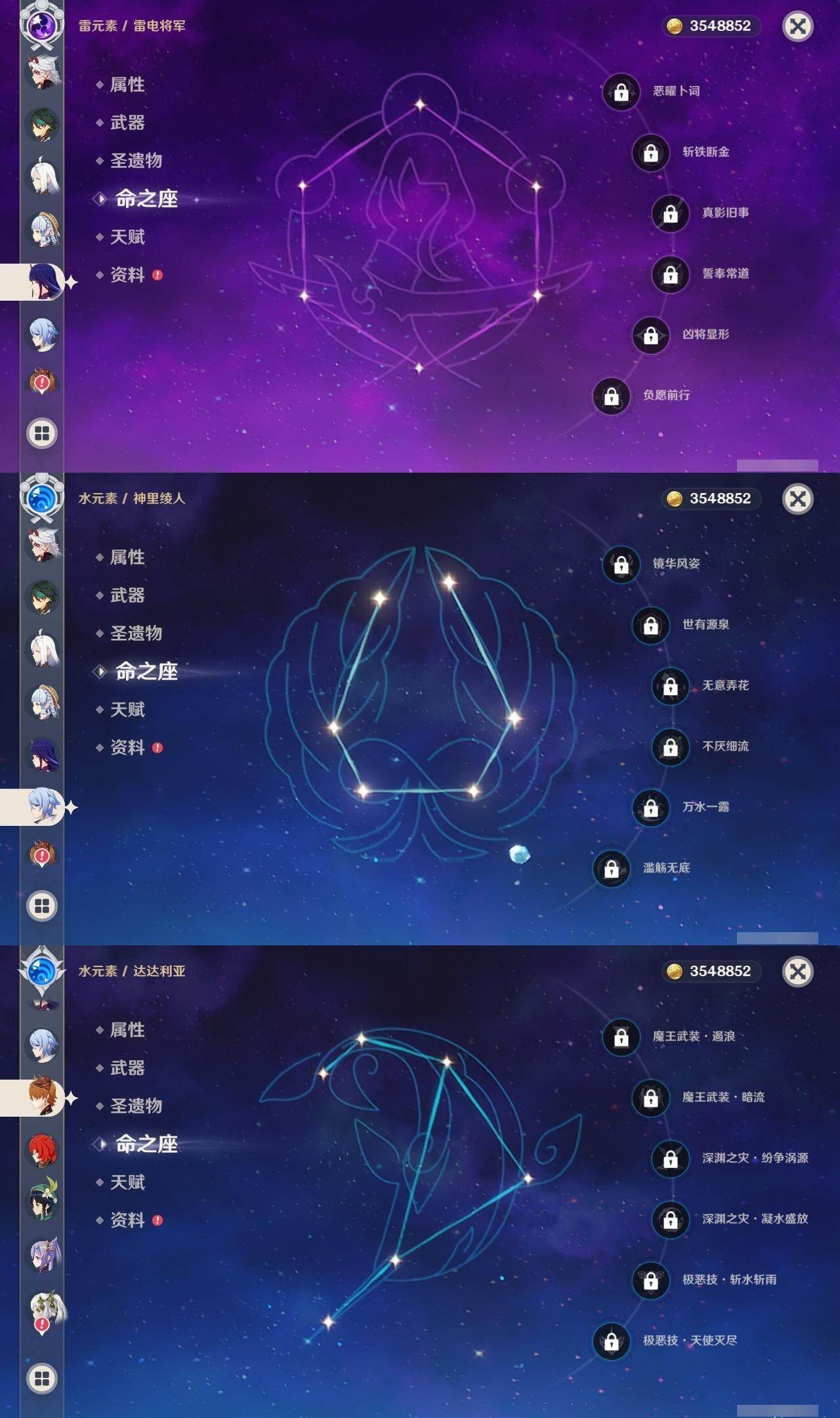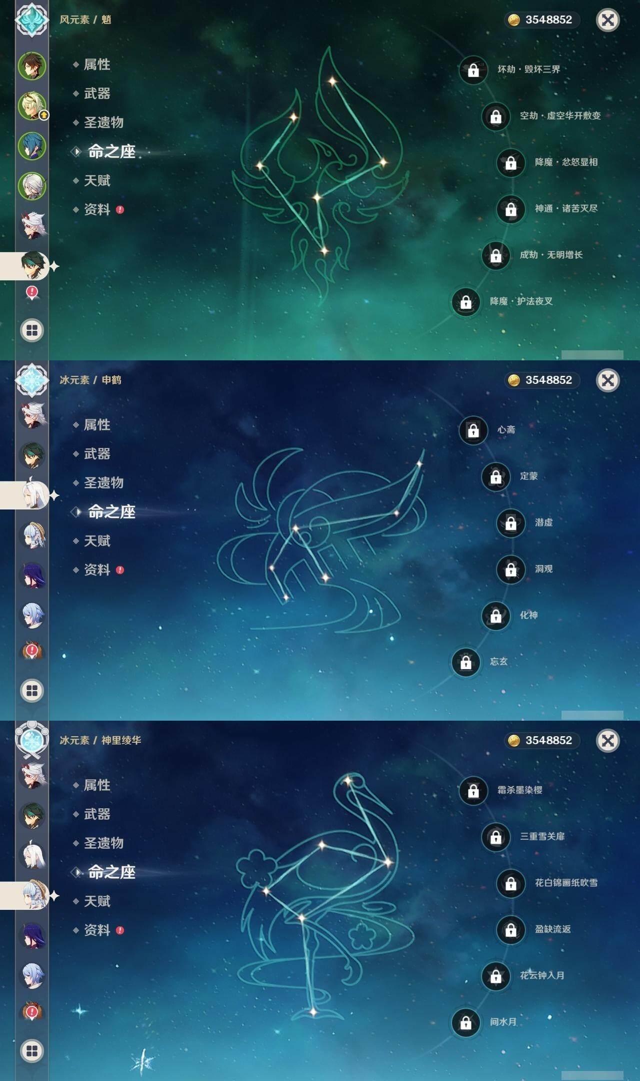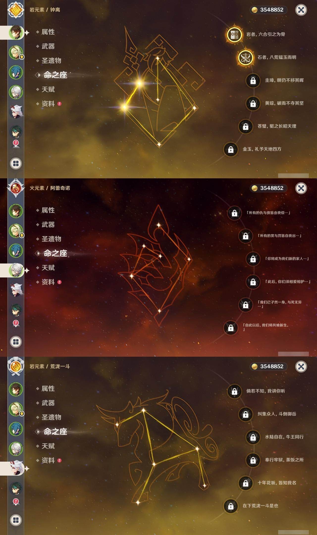 0命阿蕾奇诺,0命闲云,0命迪希雅,0命纳西妲,1命提纳里,0命神里绫人,0命申鹤,0命荒泷一斗,0命雷电将军,0命神里绫华,2命钟离,0命魈,0命宵宫,0命温迪,0命达达利亚,3命刻晴,1命莫娜,3命迪卢克,精1冬极白星,精1四风原典,精1和璞鸢,精1阿莫斯之弓,精1狼的末路,精1天空之傲